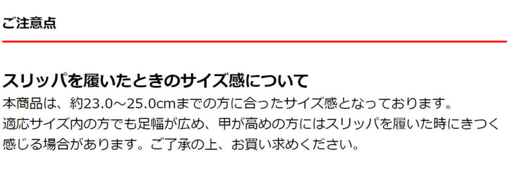 適応サイズ内の方でも足幅が広め、甲が高めの方にはスリッパを履いた時にきつく感じる場合があります。ご了承の上、お買い求めください。