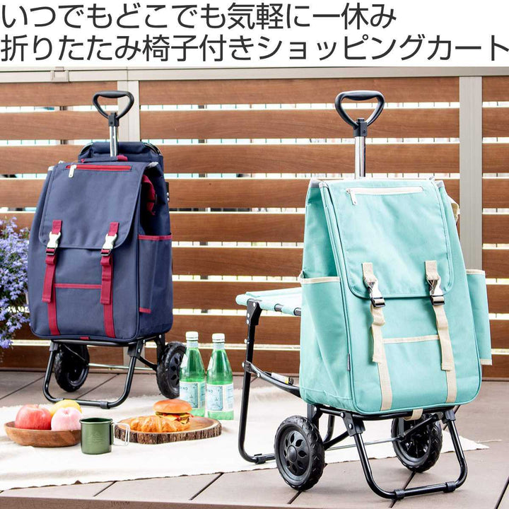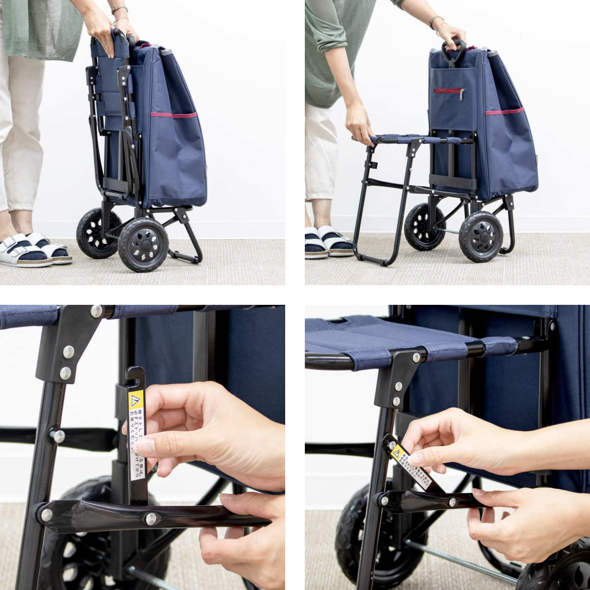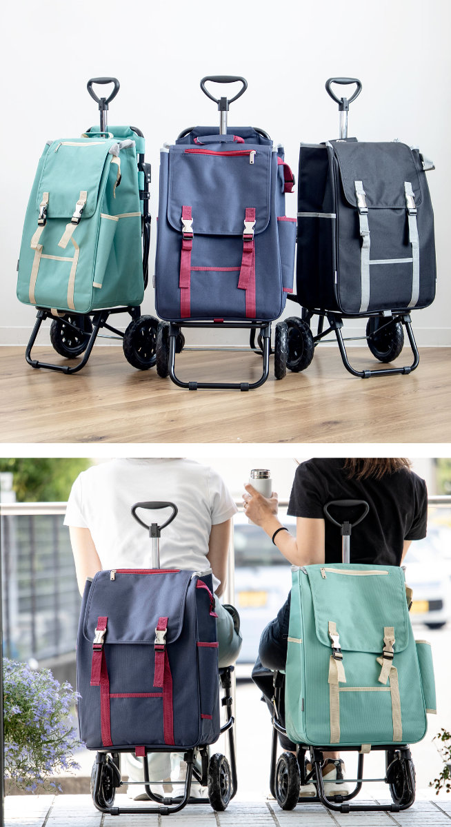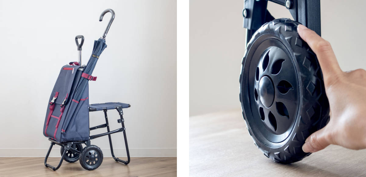 重い荷物を運ぶのに重宝するショッピングカートに、気軽に一休みできる折りたたみ椅子の機能をプラスしました。近所へのお出かけでもふと休みたくなる、そんな時に寄り添ってくれる心強いカートです。バスや電車の待ち時間、ピクニックやアウトドア、運動会等のイベントなど様々な場面で活躍します。
