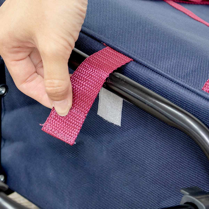 【4】バッグをハンドルに通し、面ファスナーでフレームに固定。底板をセットして完成です。