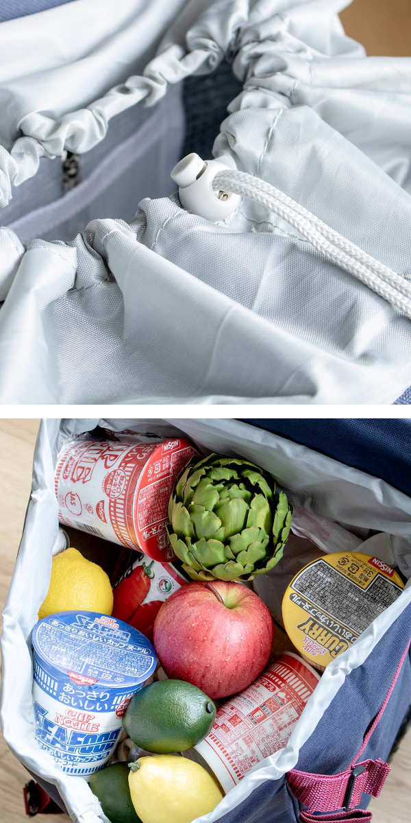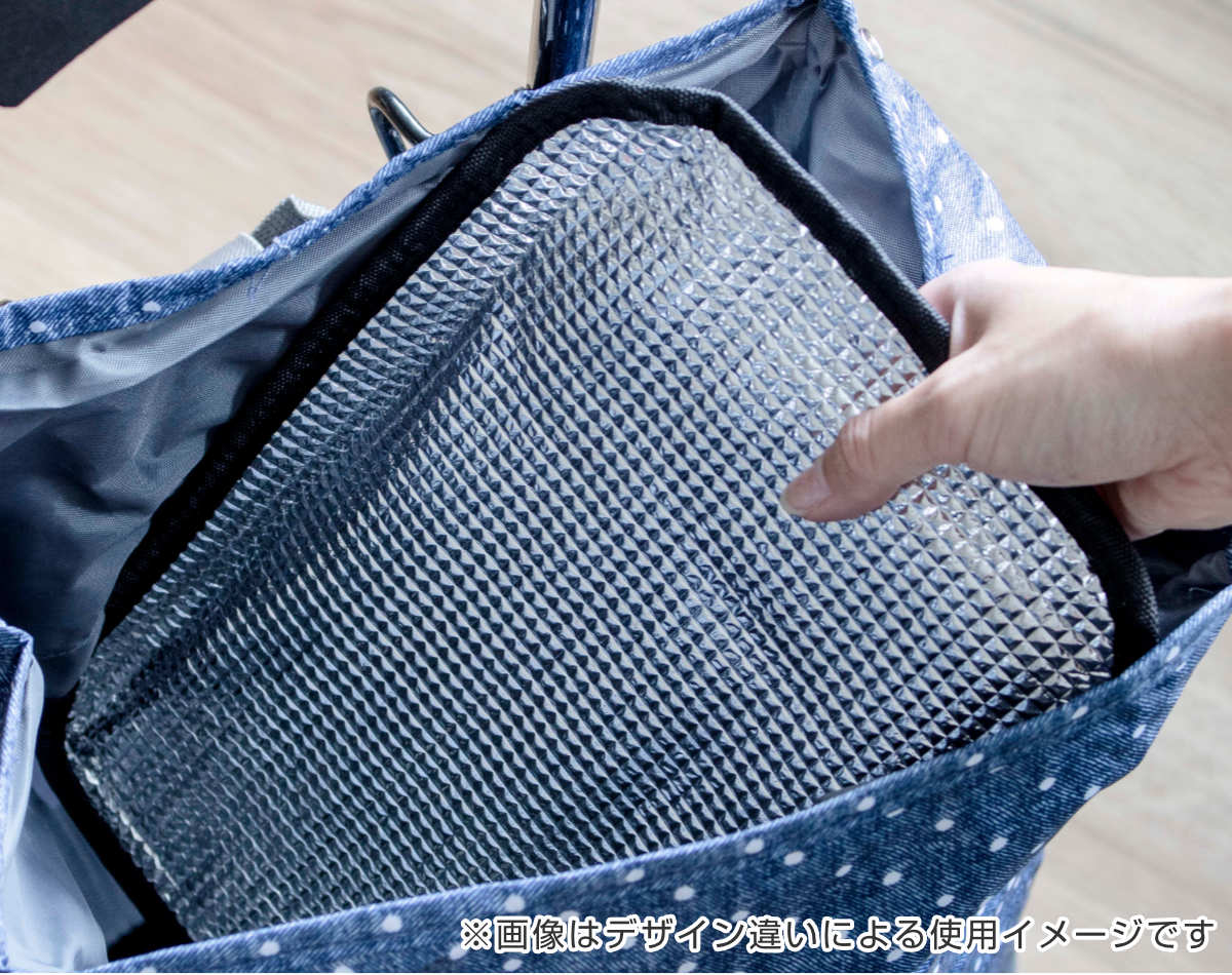バッグの内側は全面アルミ蒸着シートを張った仕様で、バッグの口を紐で絞ると保冷効果があります。一緒に保冷剤を入れておくとバッグの中を低温に保ち、冷たさをキープします。バッグには底板が付いており、安定して荷物を入れることができます。取り外すことができ、汚れた時もお手入れが簡単に出来ます。