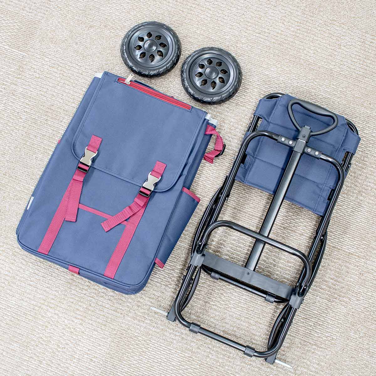 本体フレームからバッグを取り外し、折りたたむことができます。タイヤも外すことができ、使用しない時はコンパクトに収納が可能で置き場所にも困りません。