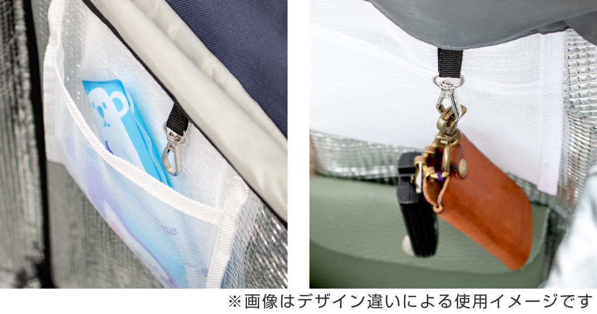 内側にメッシュ製のポケットが付いています。保冷剤を入れておくのがおすすめです。フックにはカバンの中で迷子になりがちな鍵をつけておくも便利です。また、小さな袋をぶら下げて荷物の分別にもお使いいただけます。