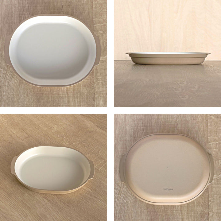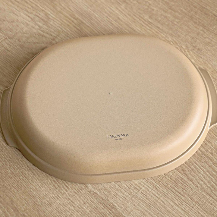表面はざらざらとした手触りでシボ加工が施されています。内側はつるつると滑らかな質感で、汚れが落ちやすく乾きもスピーディーです。裏の底面にはフードウェアブランド「TAKENAKA」の印入りです。
