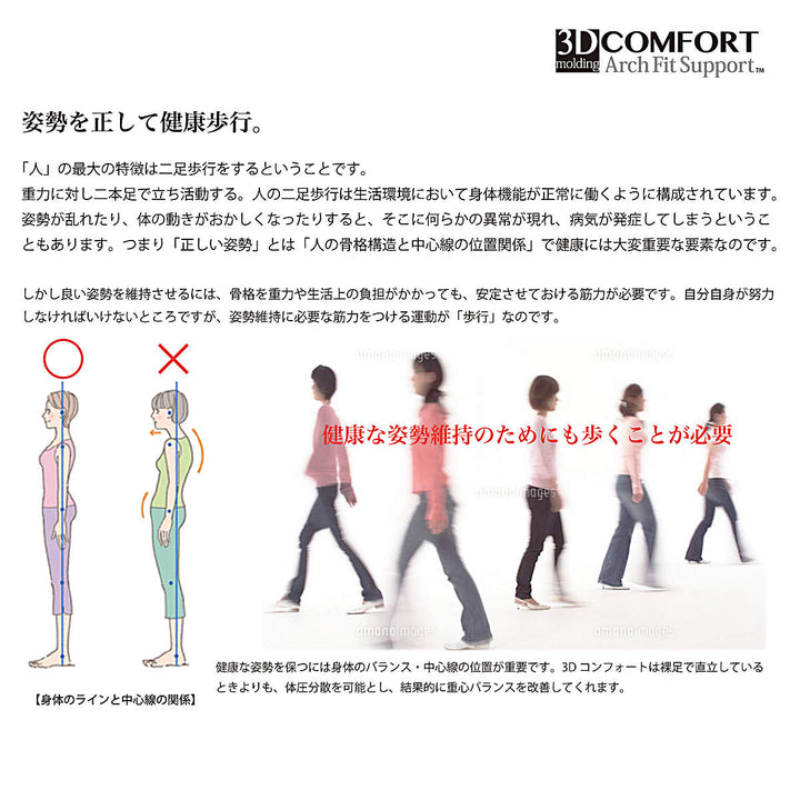 3Dコンフォートは、足の内側部分にあたるアーチを支えることで歩行運動時の衝撃を吸収。外側部分のアーチにあたる立方骨を支えることで安定した重心バランスを保ちます。足全体を包み込むようにホールドする形状は体圧分散も可能にし、足そのものの疲れや負担を優しくサポートしてくれます。