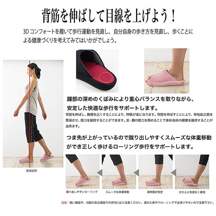 足裏のアーチに沿った3次元形状の設計により、足に優しく快適な室内履きとして開発された3Dコンフォートスリッパ。歩行スタイルと姿勢バランスをサポートしてくれます。かかと・ひざ・足首の関節への負担を軽減し、歩行時の痛みを和らげます。