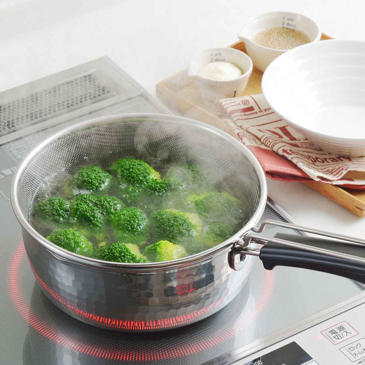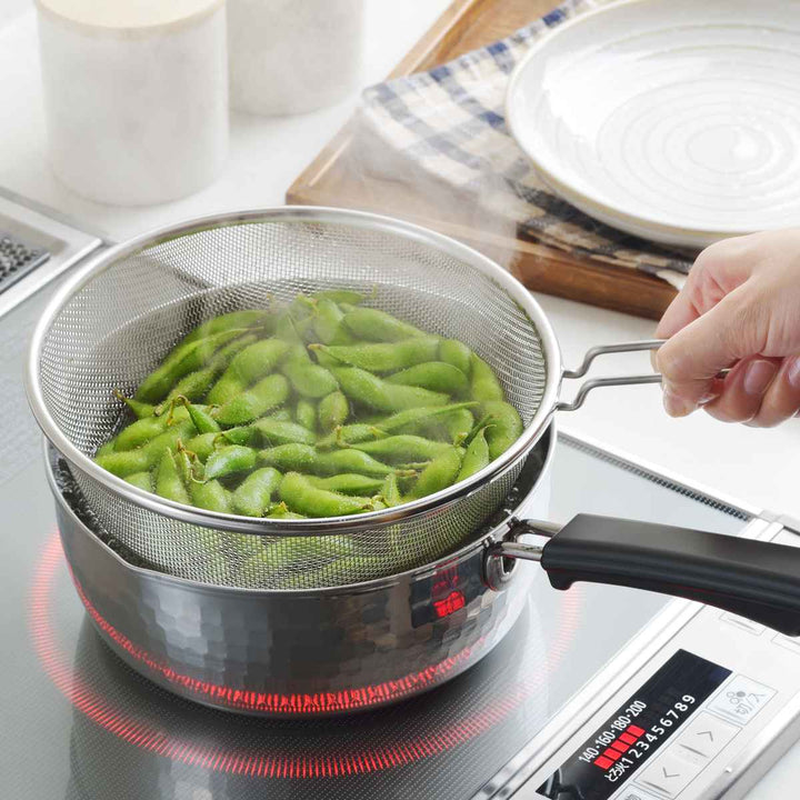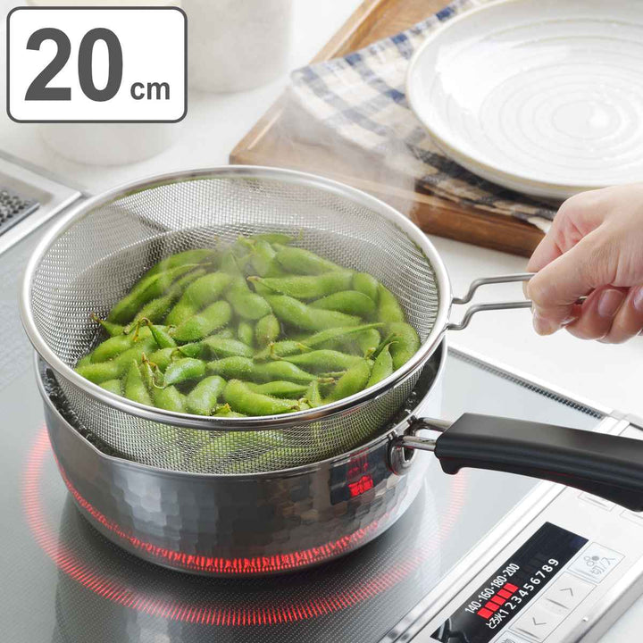 20cmの雪平鍋と合わせて使うことで、湯切りもスムーズに行えます。また耐食性に優れた18-8ステンレスを使用しているので、塩分を含む調理でも錆びにくく安心です。