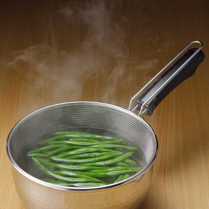 鍋とセットで使う茹でザルです。茹でたいものをザルに入れてそのまま鍋のお湯の中へ入れ、茹で上がったらサッと引き上げるだけで湯切りが完了します。熱い鍋を持ち上げてザルに移し替える手間が省けるので、鰹節の出汁をとったり、お野菜を茹でたり、毎日使いにピッタリな便利アイテムです。