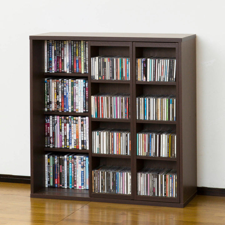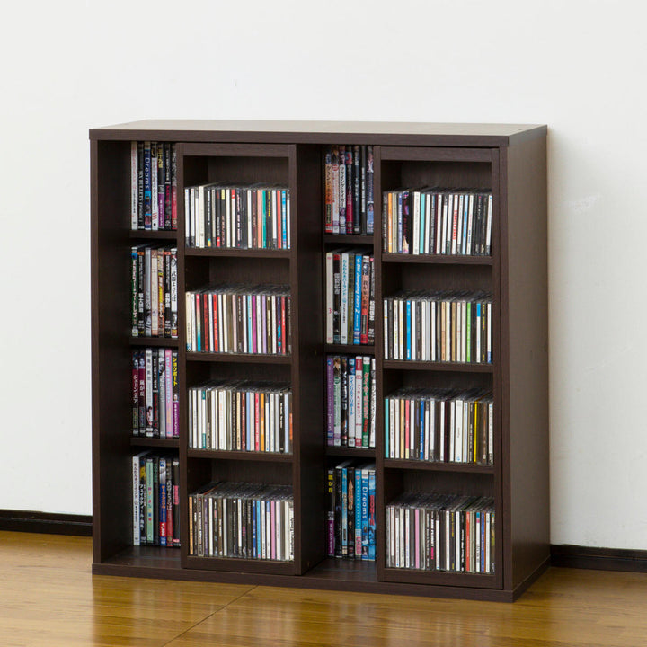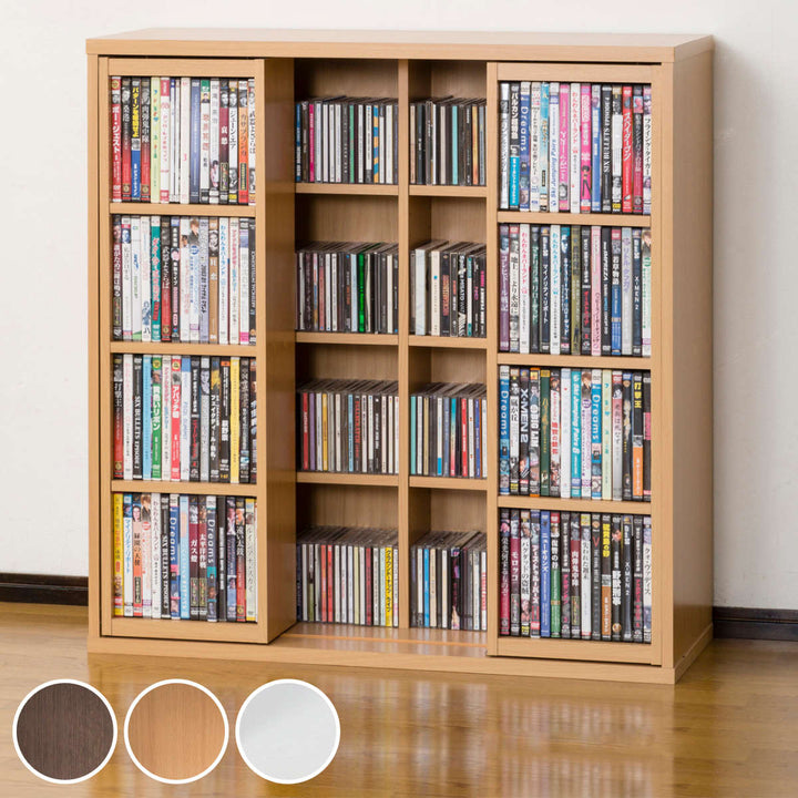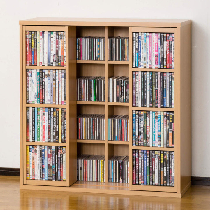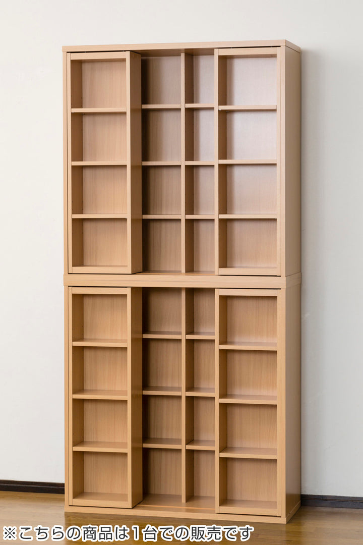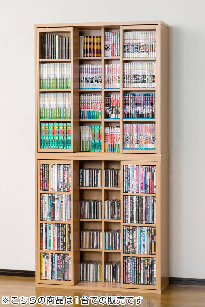 奥の棚にCD約330枚、DVD約230本、コミック本約220冊、手前スライド棚に約CD170枚、DVD約120本、コミック本約110冊を収納できます。奥行は約34cmと省スペースで設置可能です。