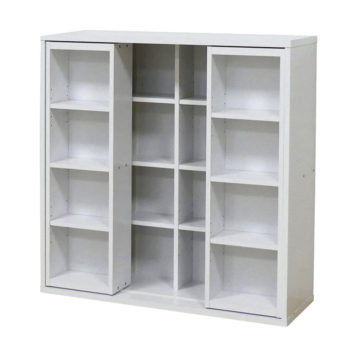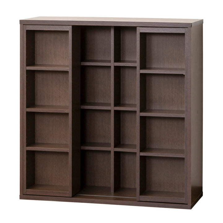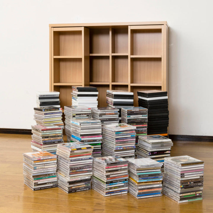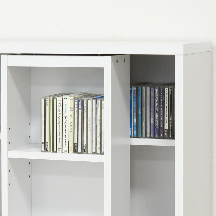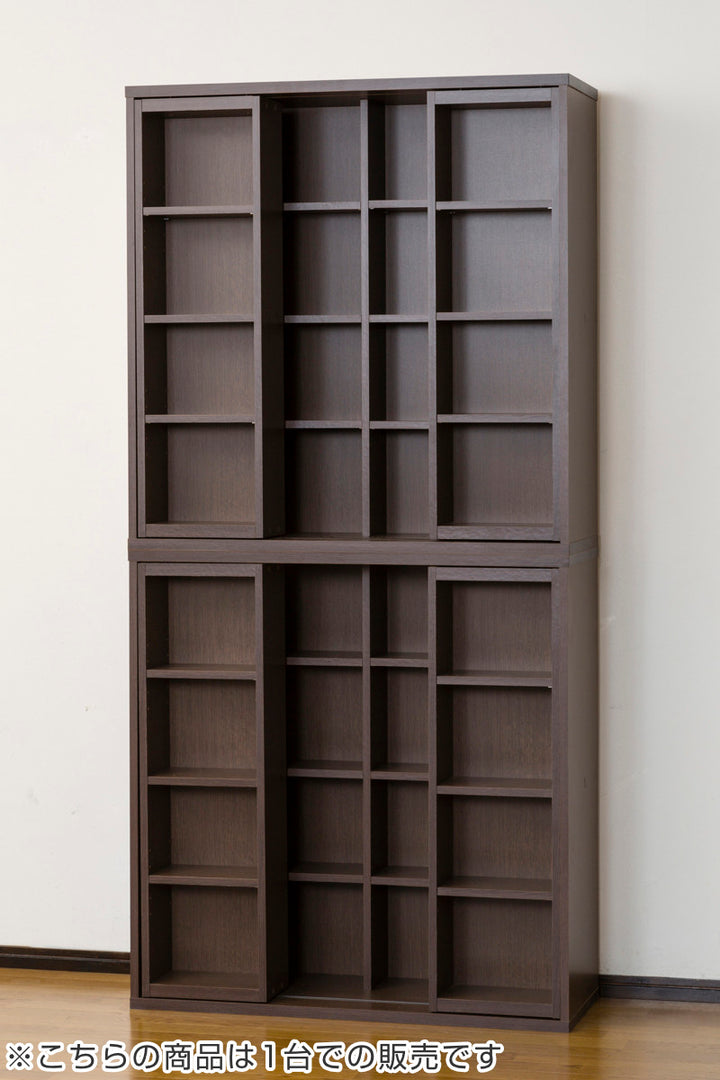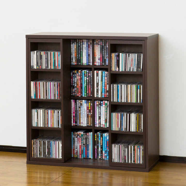 奥の棚にCD約330枚、DVD約230本、コミック本約220冊、手前スライド棚に約CD170枚、DVD約120本、コミック本約110冊を収納できます。奥行は約34cmと省スペースで設置可能です。