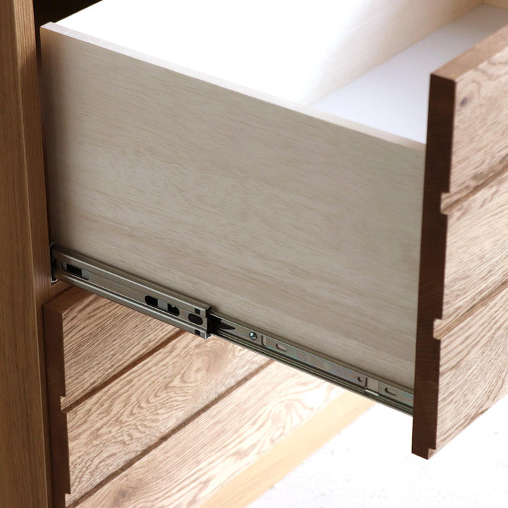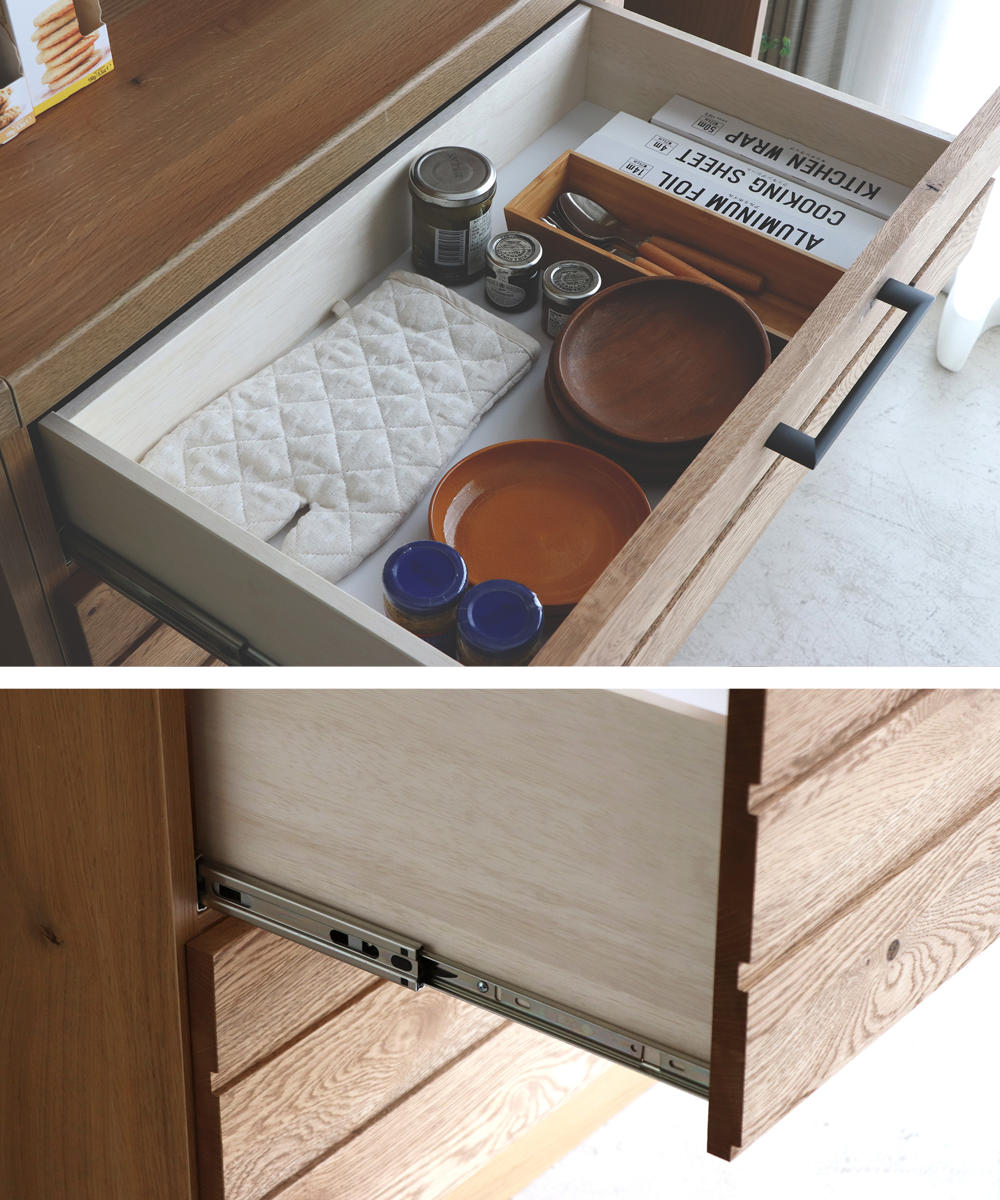 引出しはフルスライドレール仕様です。スムーズな開閉ができ、奥の物も見やすく出し入れがしやすいです。