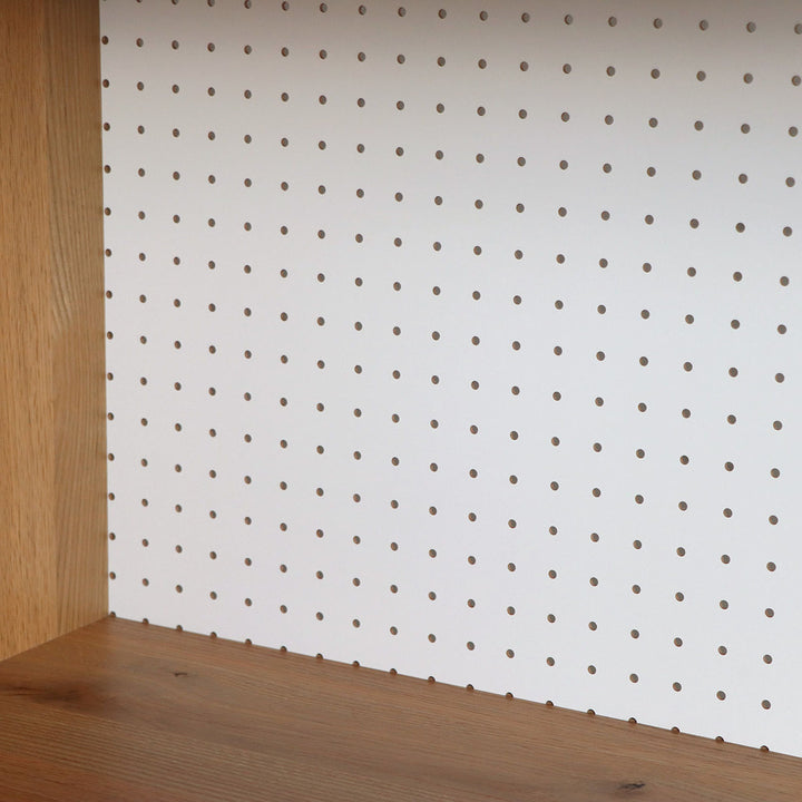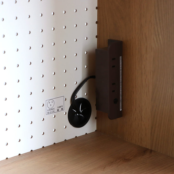 湿気やニオイを抑える特徴があるモイス付きです。背板には通気性が良い有孔ボードを使用しているので、家電の熱や湿気がこもりにくくなっています。また、2口コンセント付きなので家電製品の配線がキレイに収まります。