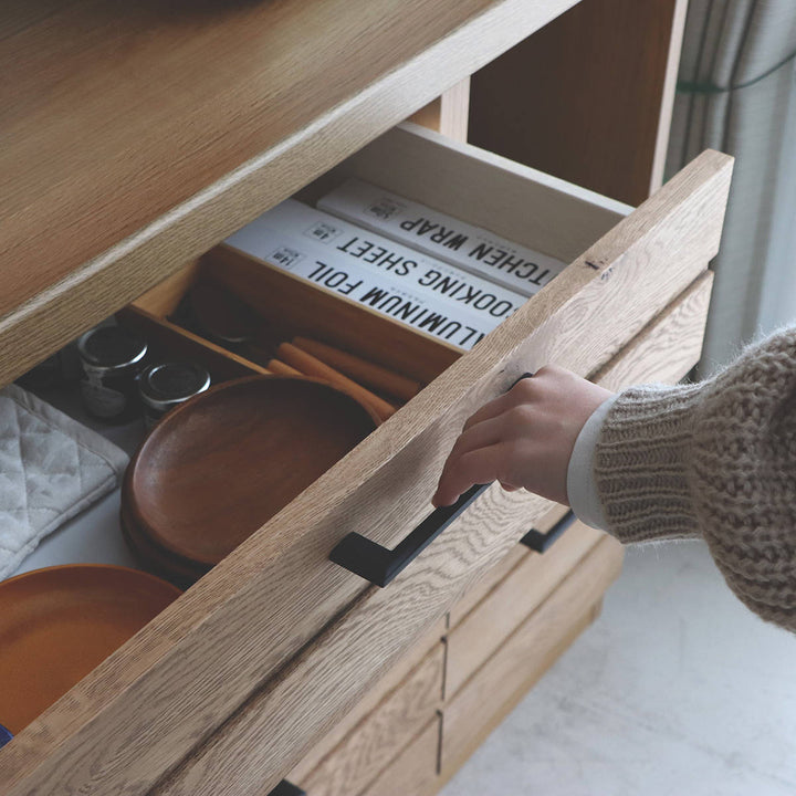 合計4杯の引出し収納付きでたっぷり収納ができます。上段の浅型の引出しにはよく使うカトラリーや細かなものの収納に、中段、下段は深さがあるのでお鍋や食器、食品ストックなどの収納に便利です。