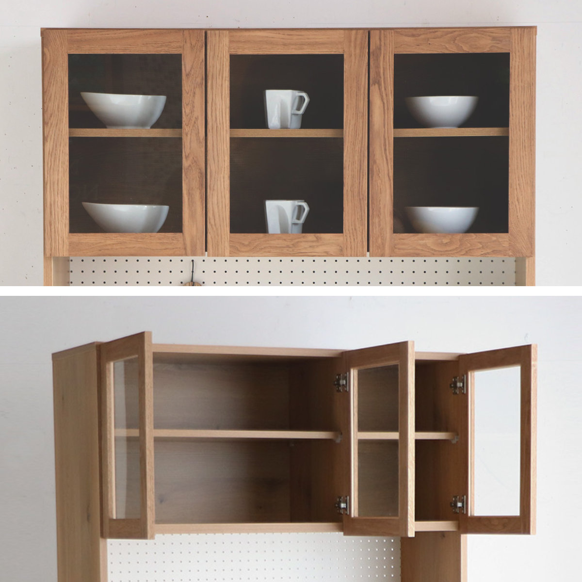 扉収納は、向かって左側は両開き、右側は片開きと2箇所あるので使い分けができます。ガラス扉なのでホコリからも守ってくれて、中が見えるのでお気に入りの食器などを飾って収納していただけます。