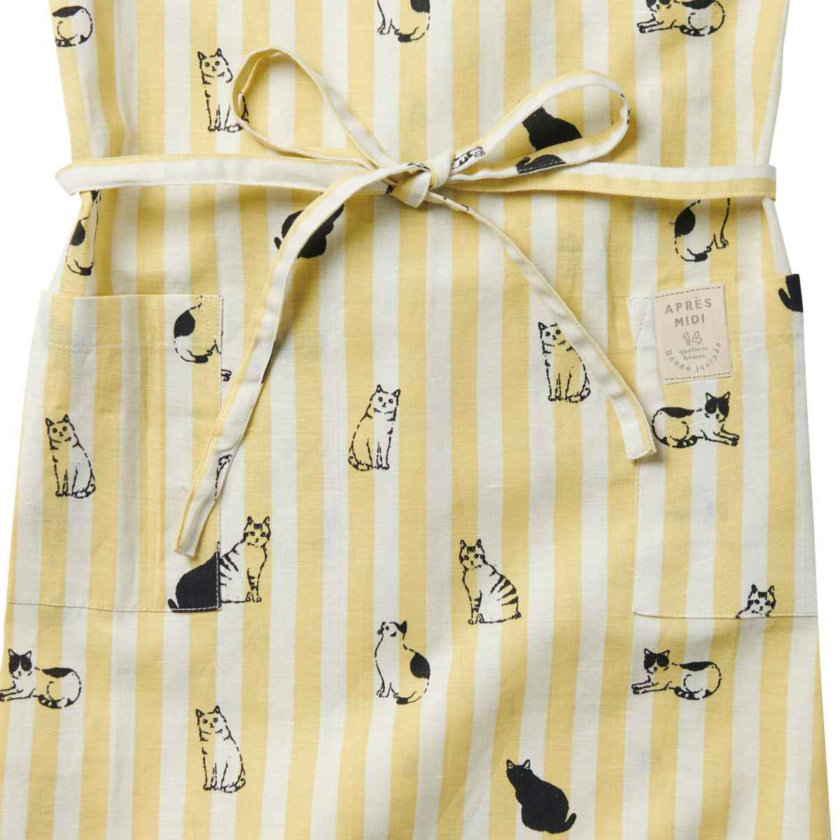 ●ヨーロッパのヴィンテージテイストを意識した手書きの猫柄と定番のストライプ柄がデザインされたエプロンです。