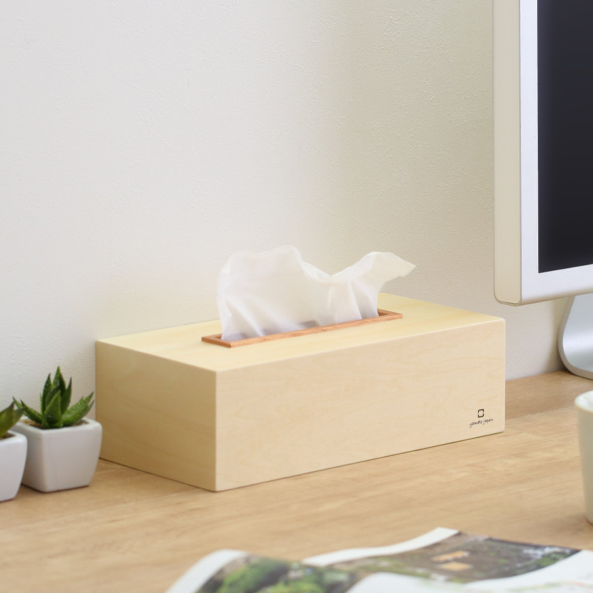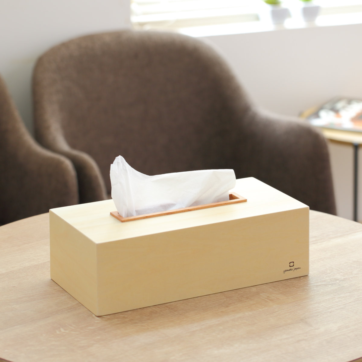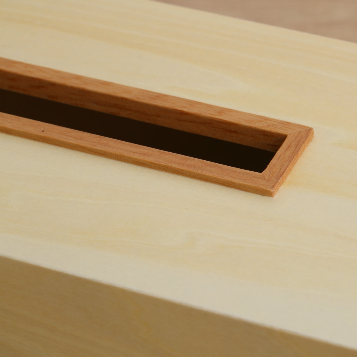取り出し口の木口に天然木をあしらったティッシュケースです。無駄のないすっきりとしたフォルムで、使う場所を選びません。飽きの来ないシンプルなデザインなので末永く愛用していただけます。