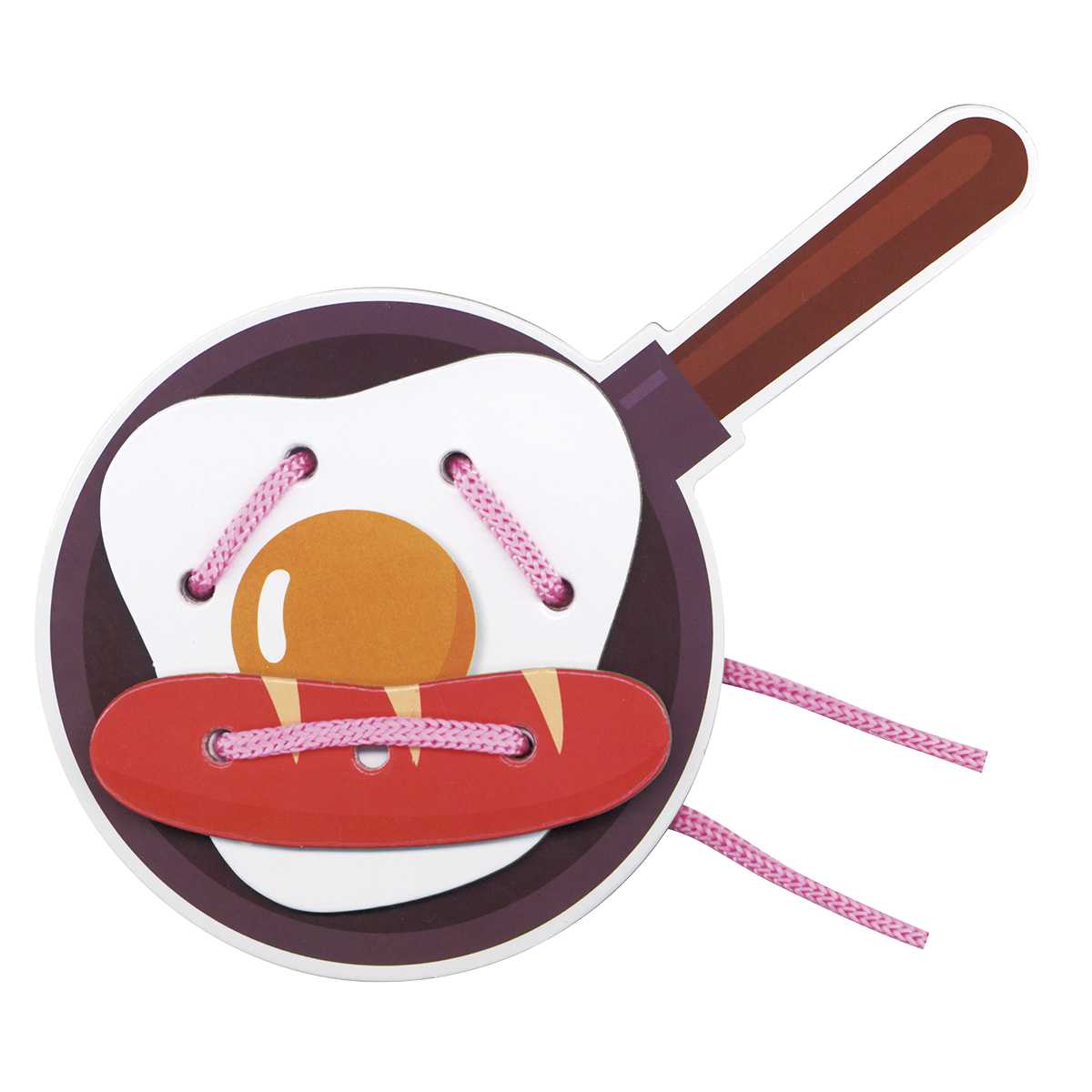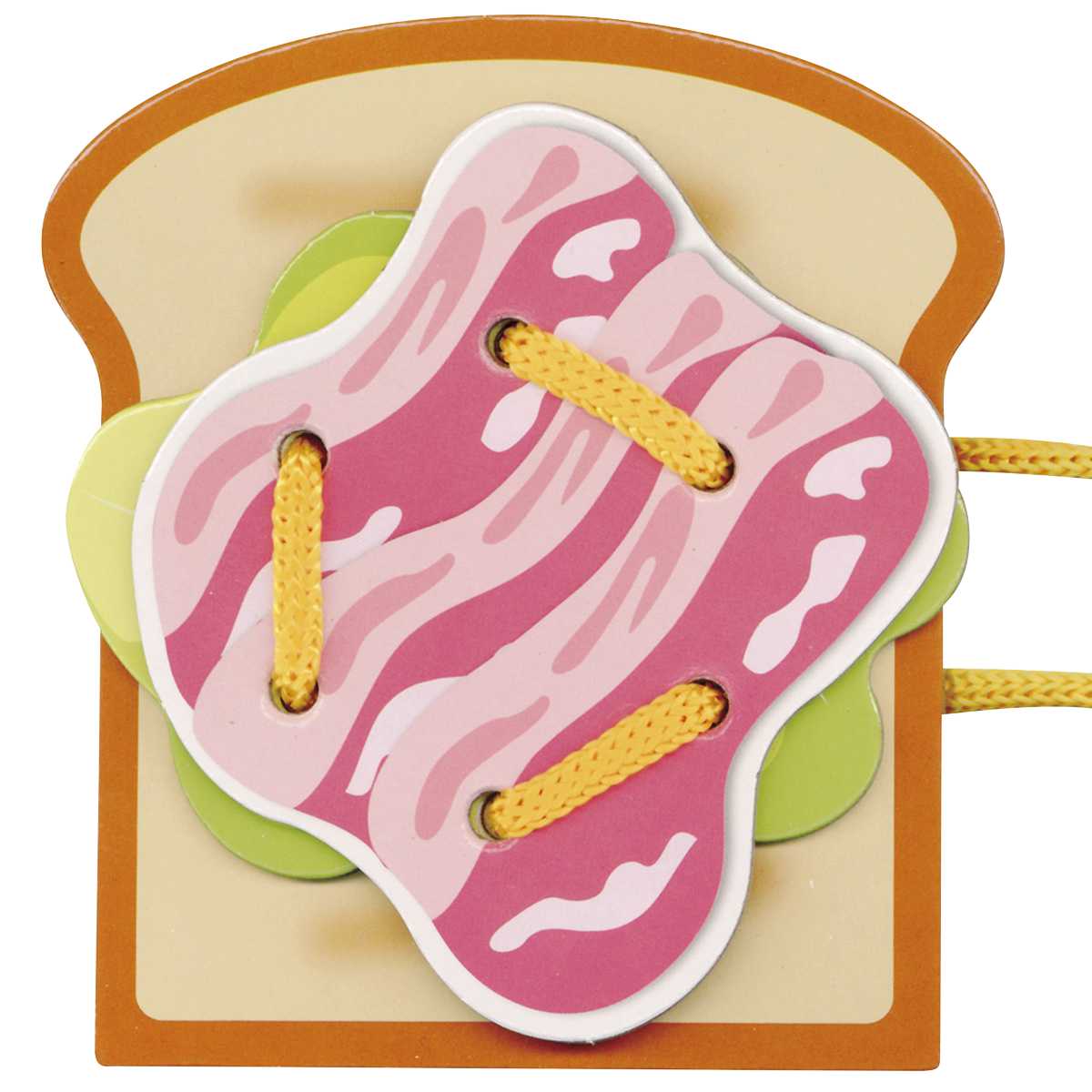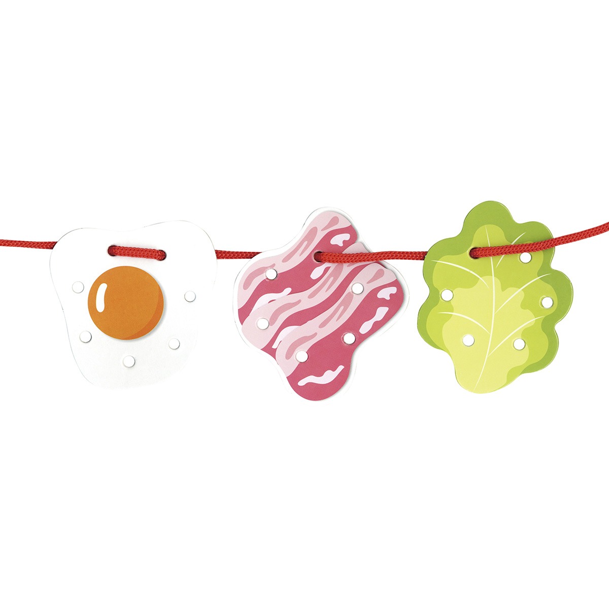 穴をあけたパンや目玉焼きのパーツに、ひもを通して遊びます。できるだけ多くの穴にひもを通したり、パーツを組み合せて通したり、自由に遊びながら脳の発達を促し、集中力を養う遊びです。