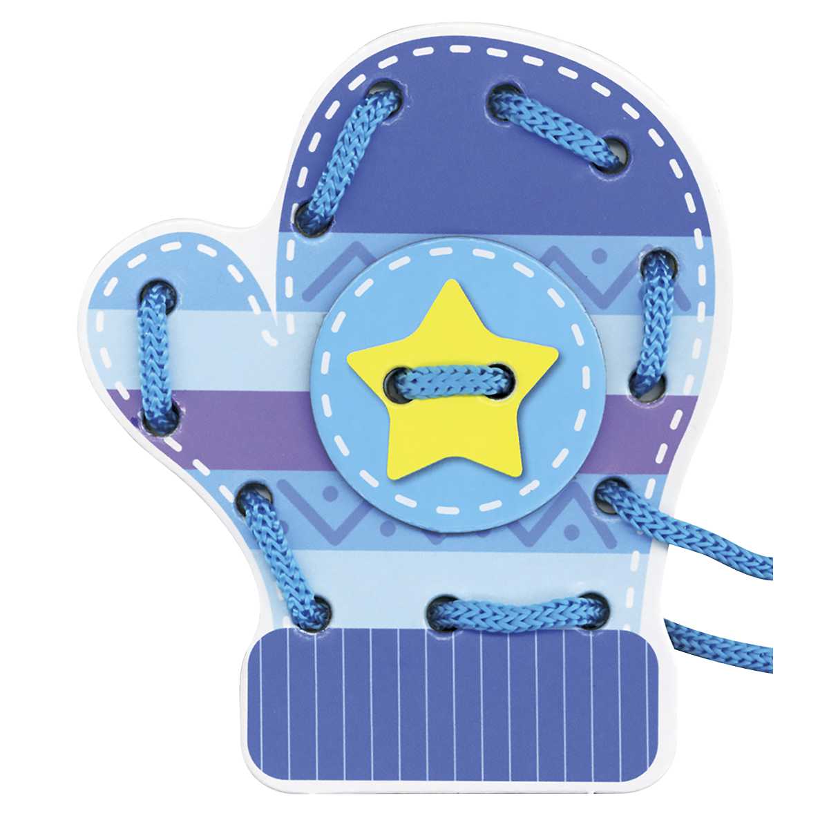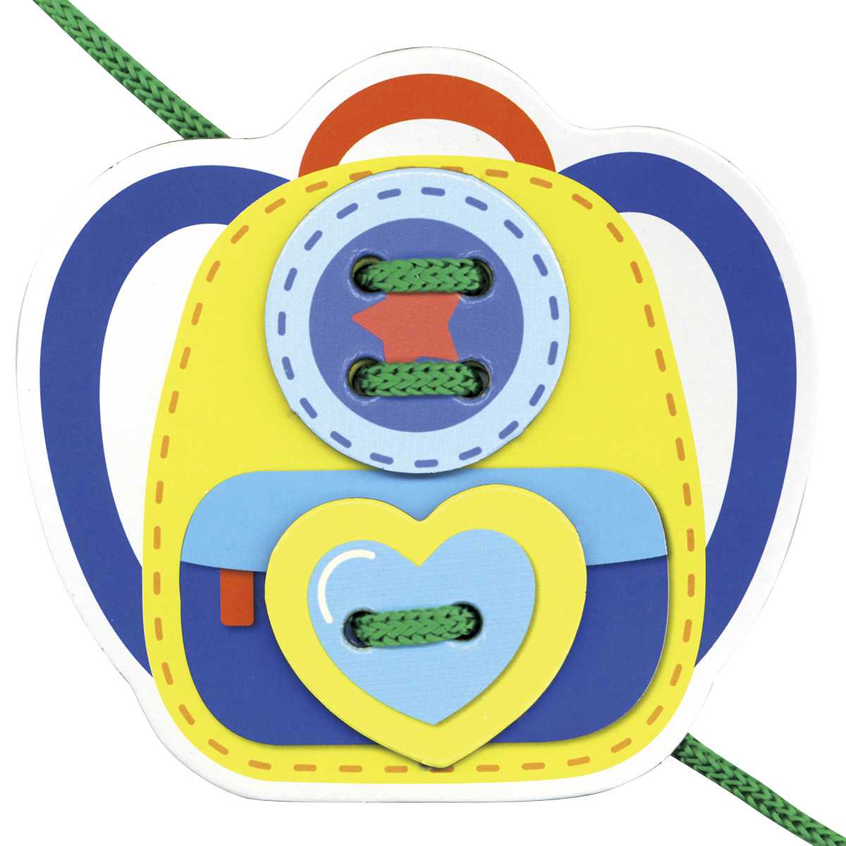 穴をあけた手袋やリュックのパーツに、ひもを通して遊びます。できるだけ多くの穴にひもを通したり、パーツを組み合せて通したり、自由に遊びながら脳の発達を促し、集中力を養う遊びです。