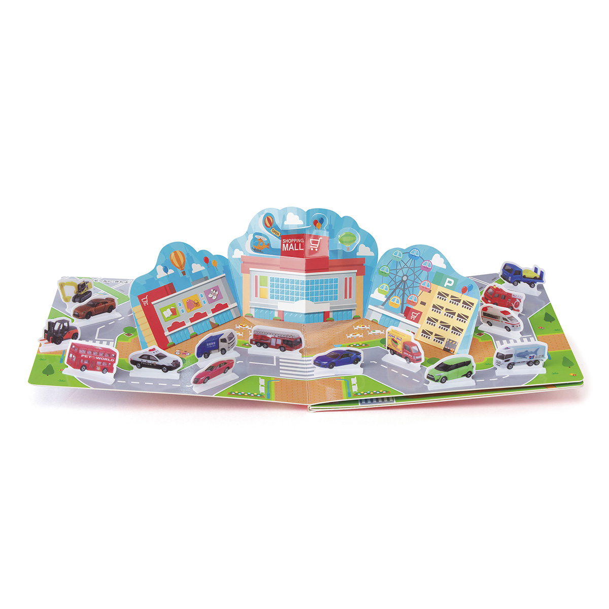 シールは全部で32枚、1~6ページ、裏面の、どのページにも貼って遊ぶことができます。1、2ページ目は飛び出す絵本、3、4ページ目は平面の街、5、6ページは工事現場なので、シチュエーションに合わせて想像を膨らませながら、遊ぶことができます。