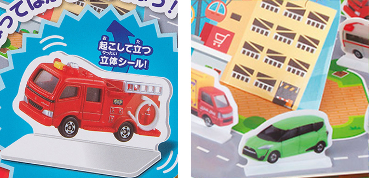 折り線で谷折りすればシールが立ち上がるので、立体感のある世界が楽しめます。飛び出す絵本のページに貼れば、より立体感を感じながら遊べます。