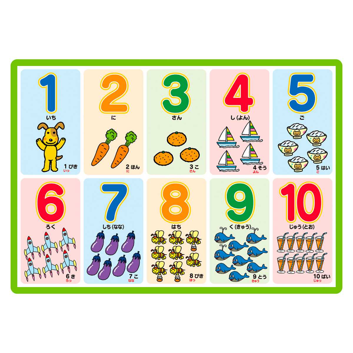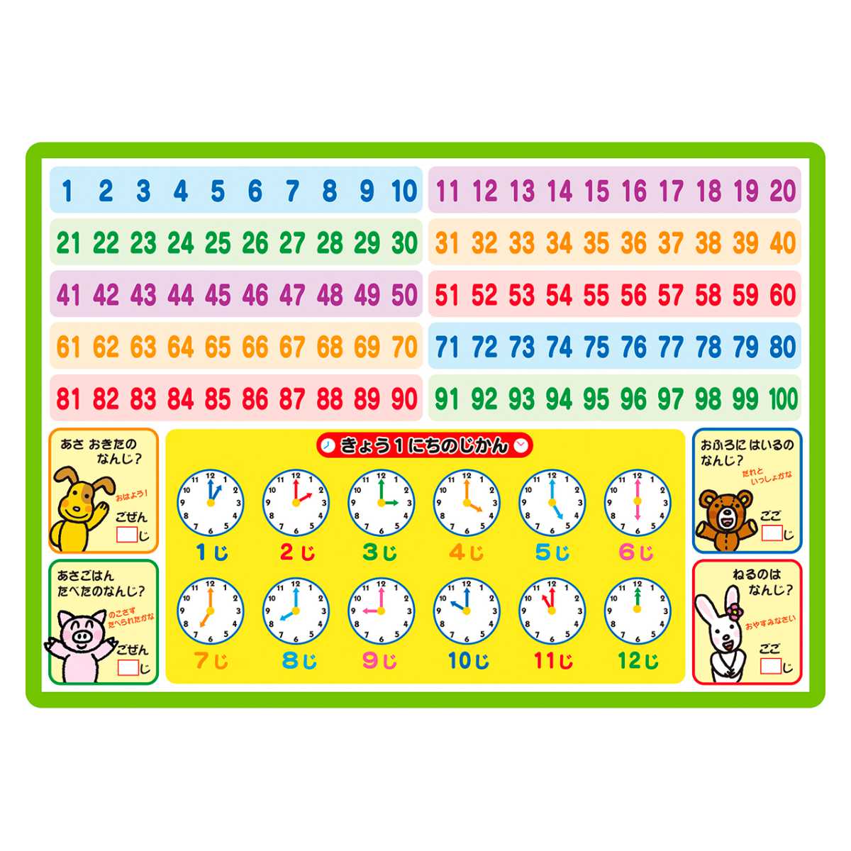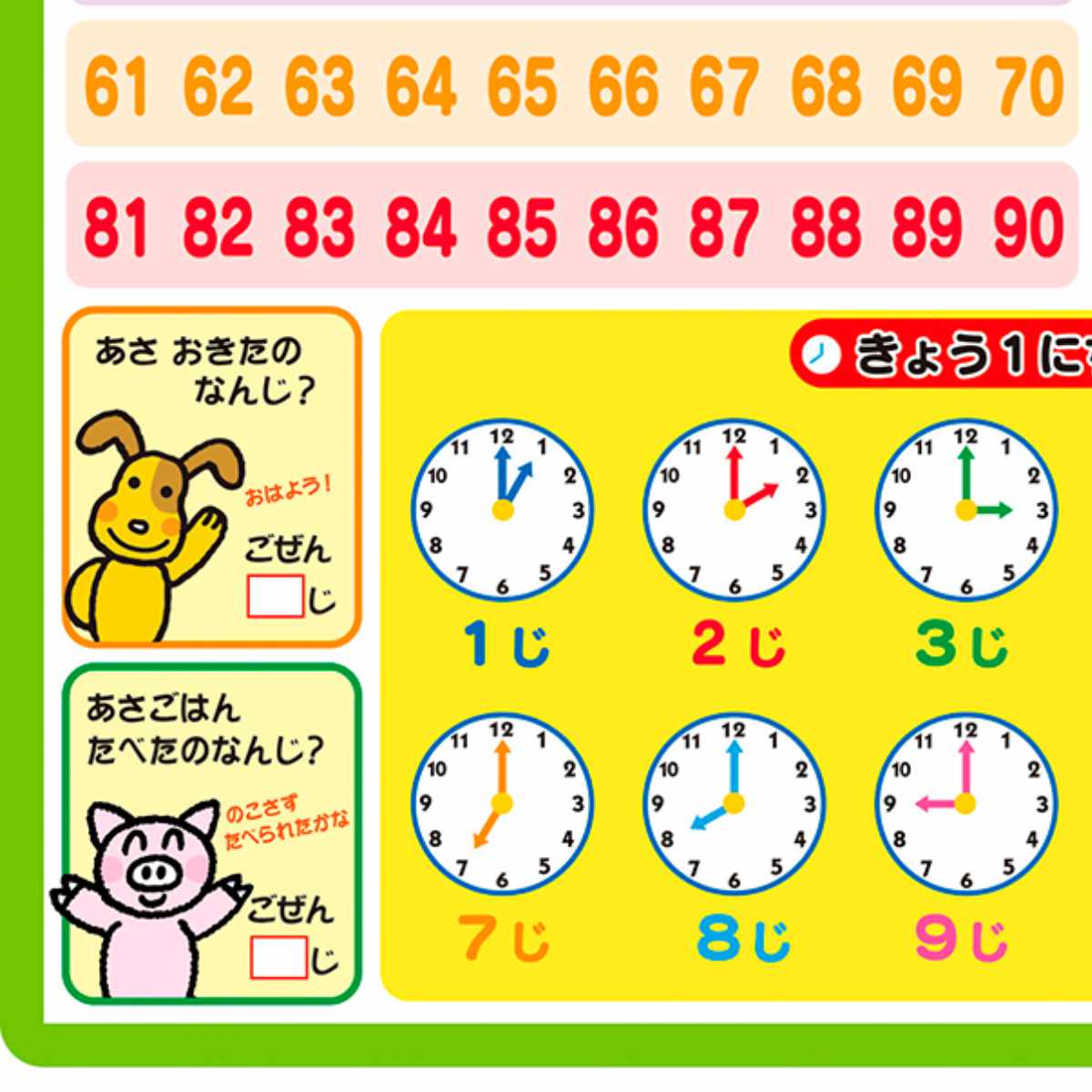 このシートで「すうじ」「すうじの読み方」「かずと単位」「とけい」のおけいこができます。1~10まで、1~100までと時計のおけいこの2種類のシートがセットになっており、すうじの感覚をイラストを交えて楽しくおけいこできます。一緒に声に出して読むなど親子のコミュニケーションをはかりながら、お風呂タイムを活用してお勉強ができます。