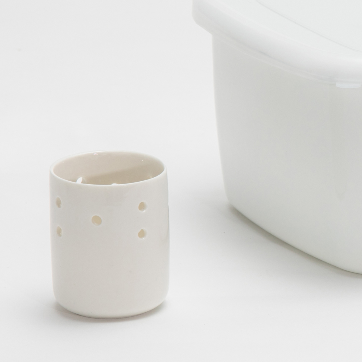 | 材質 | 本体:ほうろう用鋼板 フタ:ポリエチレン樹脂 水取器:陶器 |