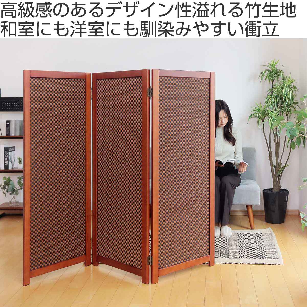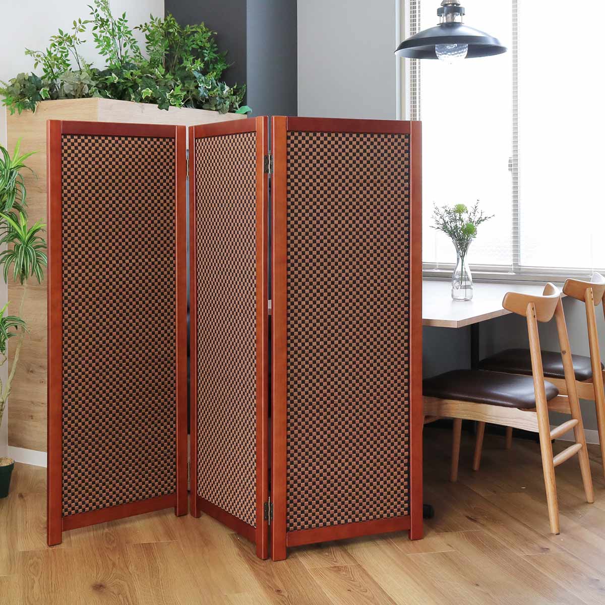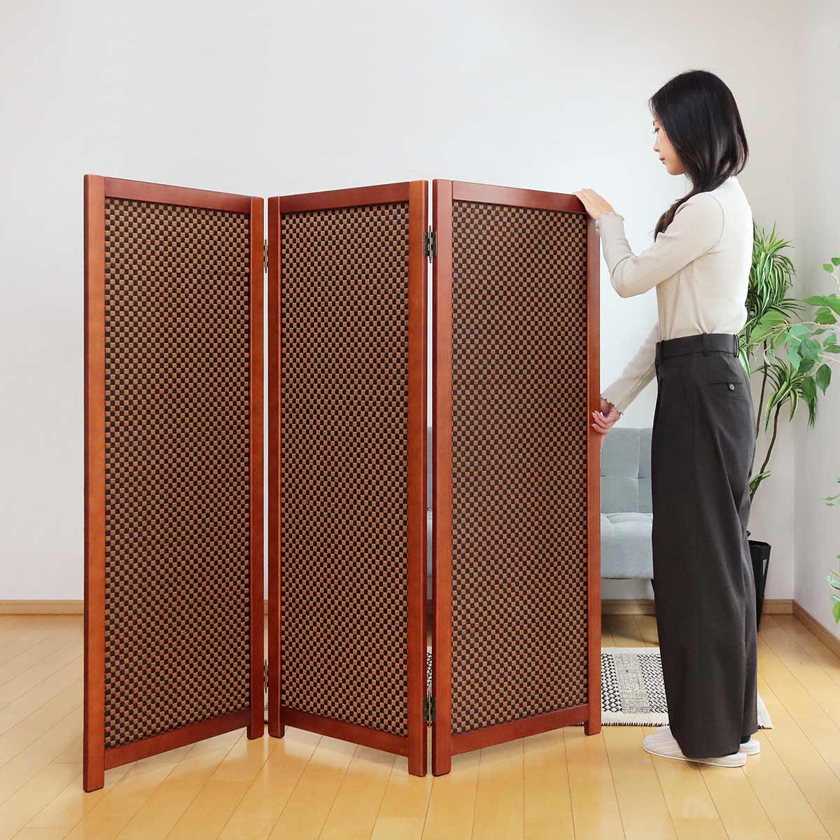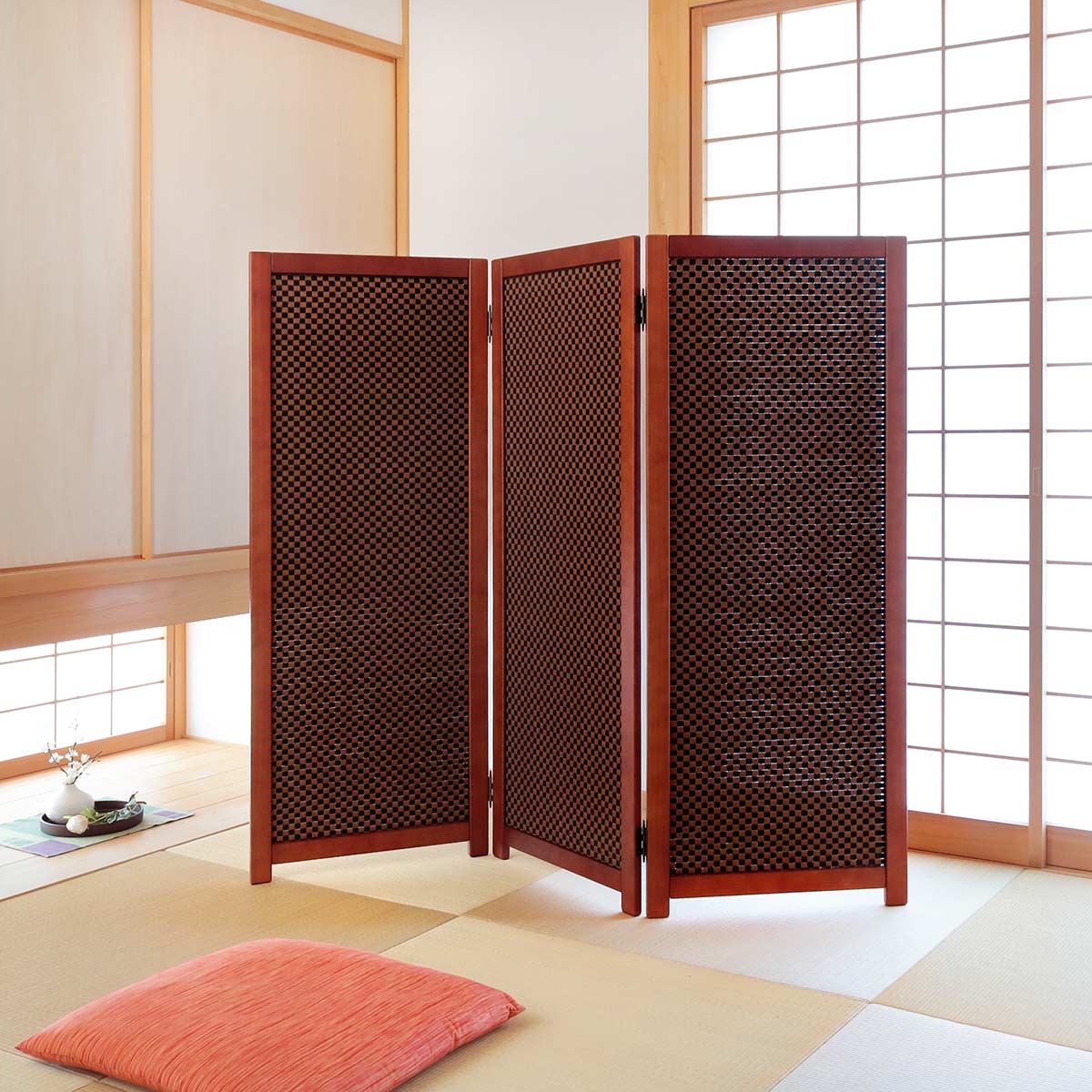 高級感あるブラウンの天然木の枠にデザイン性溢れる竹生地をはめ込んだ、国産仕上げの高級和風衝立です。