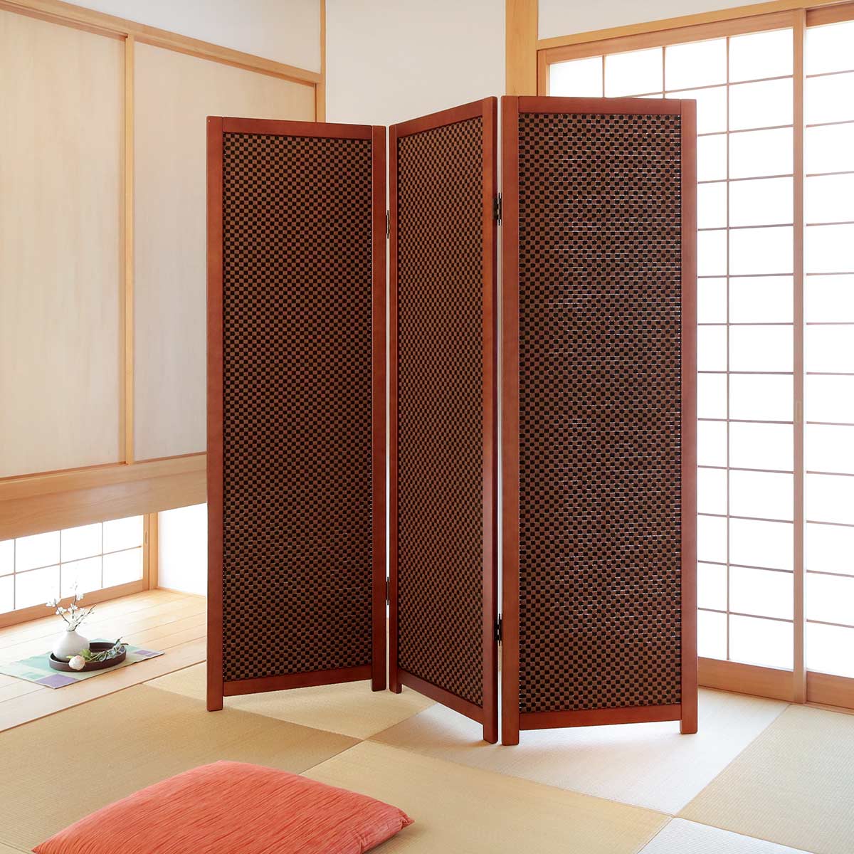 高級感あるブラウンの天然木の枠にデザイン性溢れる竹生地をはめ込んだ、国産仕上げの高級和風衝立です。