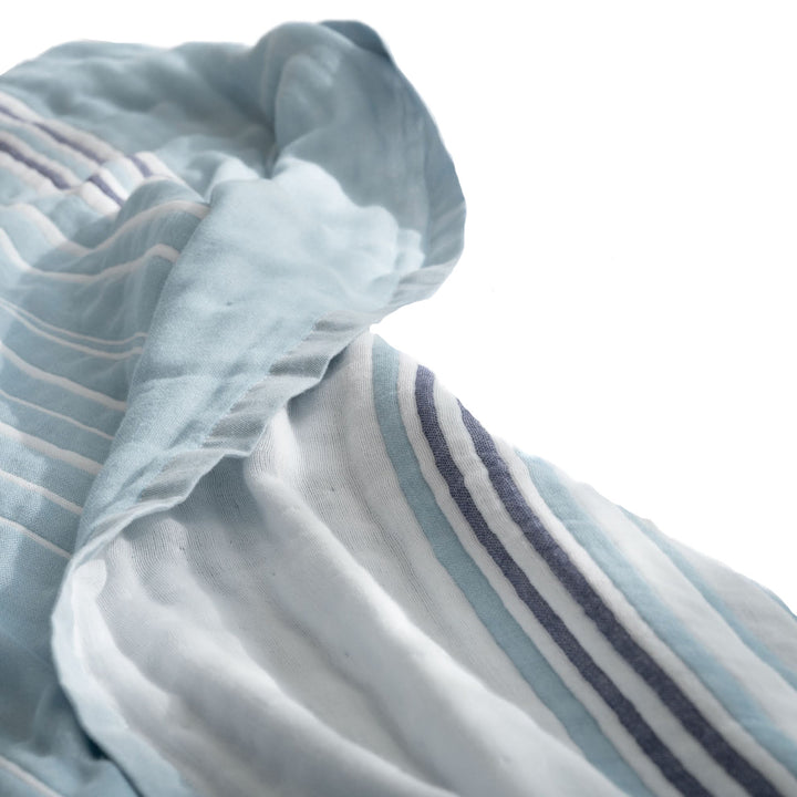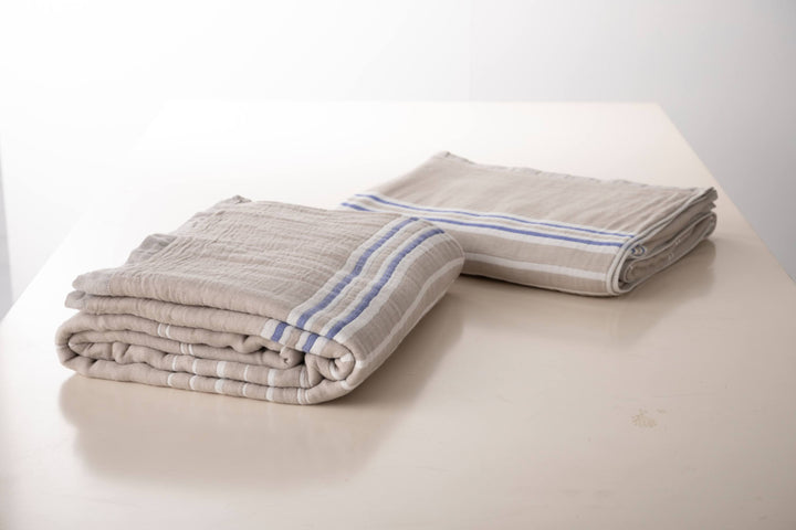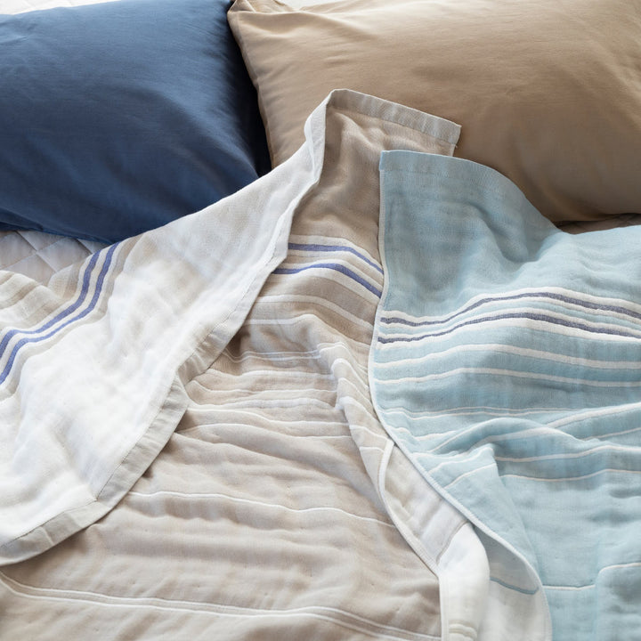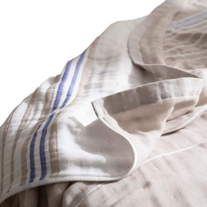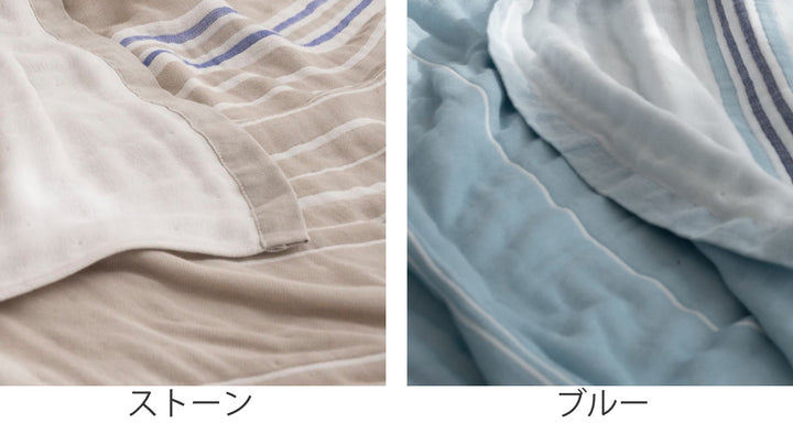 織り目の異なるガーゼを6重に織り上げたガーゼケットです。肌が直接ふれる外側のガーゼは、やわらかい細めの糸で密度を高くしているので良い肌ざわりです。中に重ねたガーゼは糸の太さ・粗さを調整することで空気をたっぷり含み、軽くて通気性・保湿性に優れています。