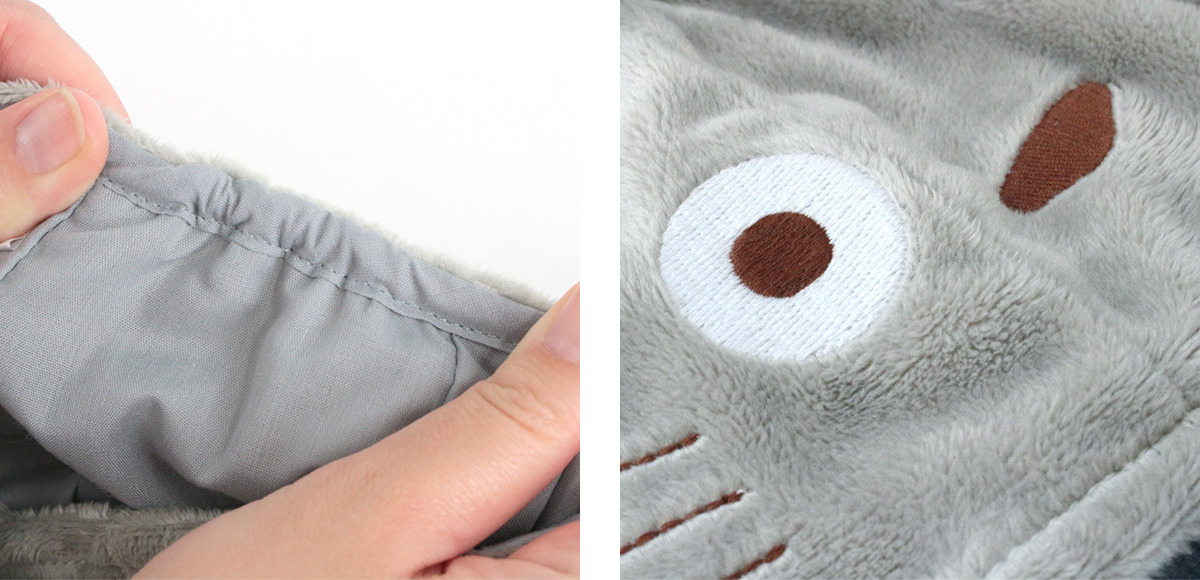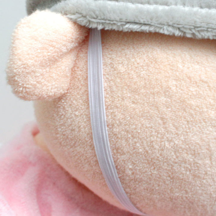 もこもこの起毛素材でふんわりと優しい肌触りです。帽子の後ろ側はゴム仕様なので頭にフィットします。また、あご紐がついているので安心です。