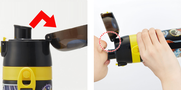 水筒の蓋はボタンを押すだけで開けることができるワンタッチ式です。飲み終わったら蓋をカチッと閉めるだけなので、小さなお子様でも簡単に開閉できます。