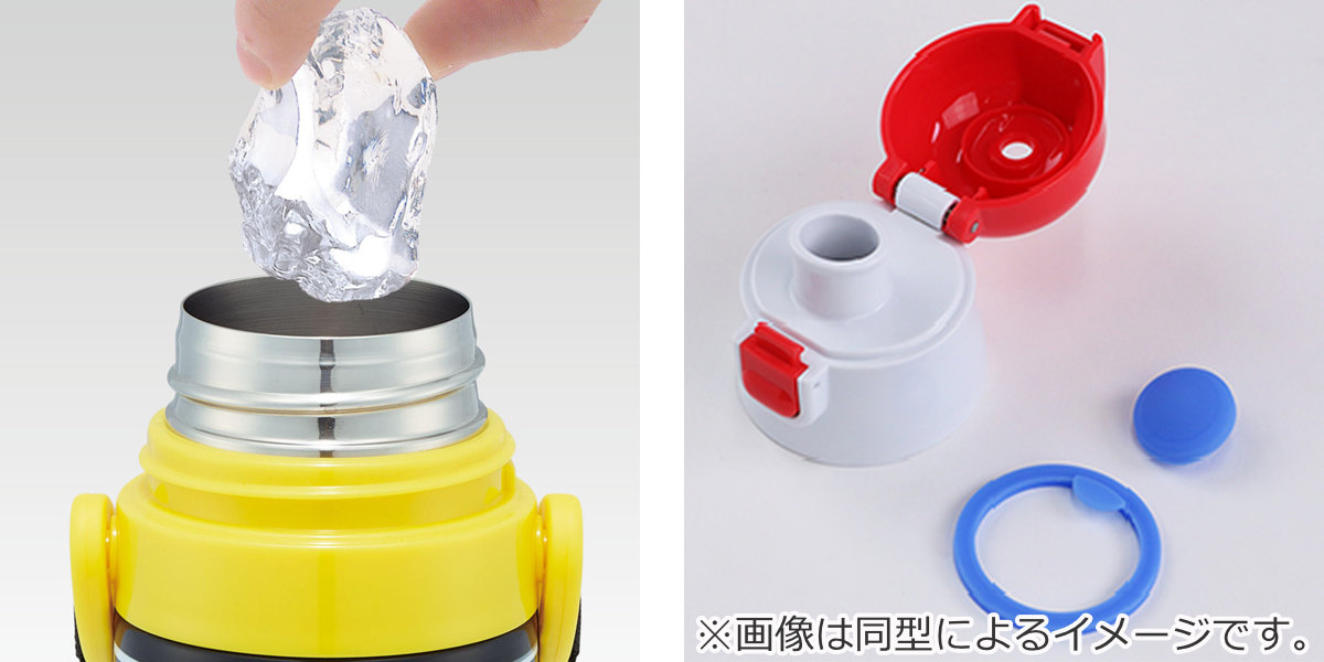 口径が広いので大きな氷も入れやすく、しっかり洗えて清潔に保てます。キャップユニットに付属しているパッキンは2つだけなので、お手入れ簡単です。