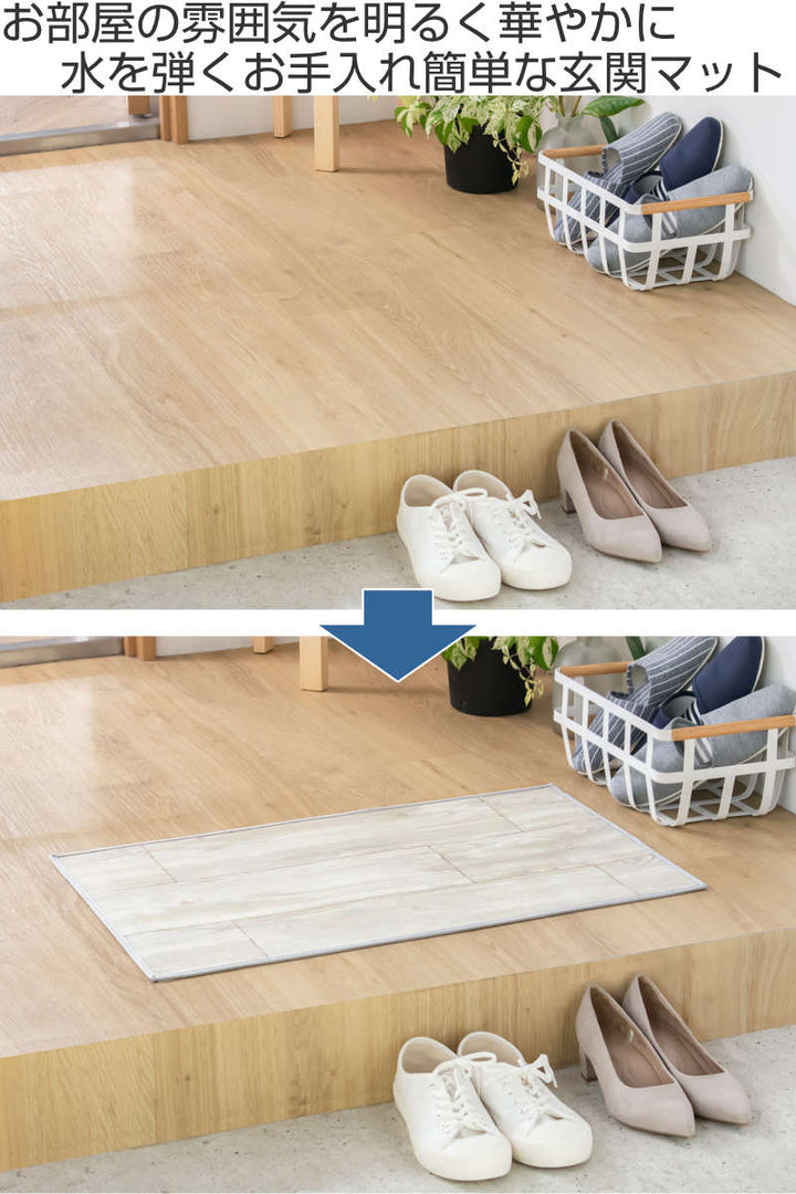 表面に防水、撥水効果のある塩化ビニル素材を使用しています。雨の日や濡れた足でもマットに染み込まずに水を弾いてくれます。サッと拭き取るだけなのでお手入れも簡単。きれいな状態を長く保ち、快適な空間を創ります。