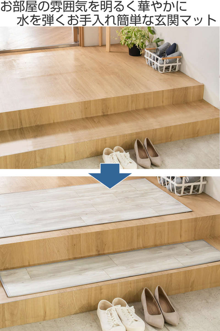表面に防水、撥水効果のある塩化ビニル素材を使用しています。雨の日や濡れた足でもマットに染み込まずに水を弾いてくれます。サッと拭き取るだけなのでお手入れも簡単。きれいな状態を長く保ち、快適な空間を創ります。