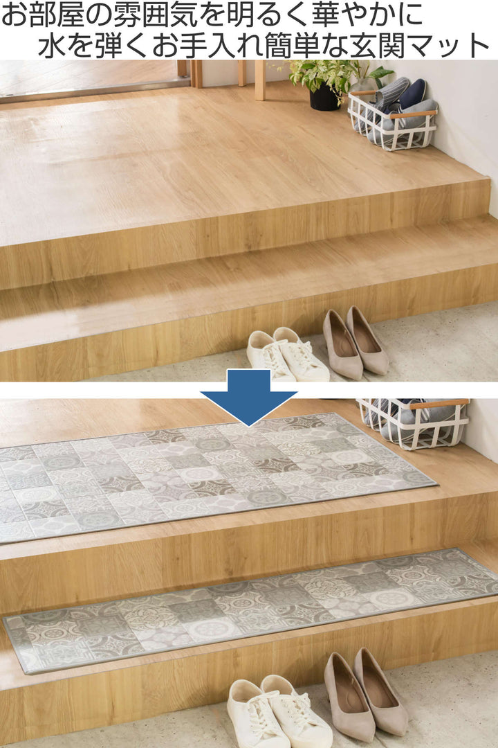表面に防水、撥水効果のある塩化ビニル素材を使用しています。雨の日や濡れた足でもマットに染み込まずに水を弾いてくれます。サッと拭き取るだけなのでお手入れも簡単。きれいな状態を長く保ち、快適な空間を創ります。
