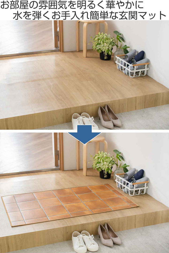 表面に防水、撥水効果のある塩化ビニル素材を使用しています。雨の日や濡れた足でもマットに染み込まずに水を弾いてくれます。サッと拭き取るだけなのでお手入れも簡単。きれいな状態を長く保ち、快適な空間を創ります。