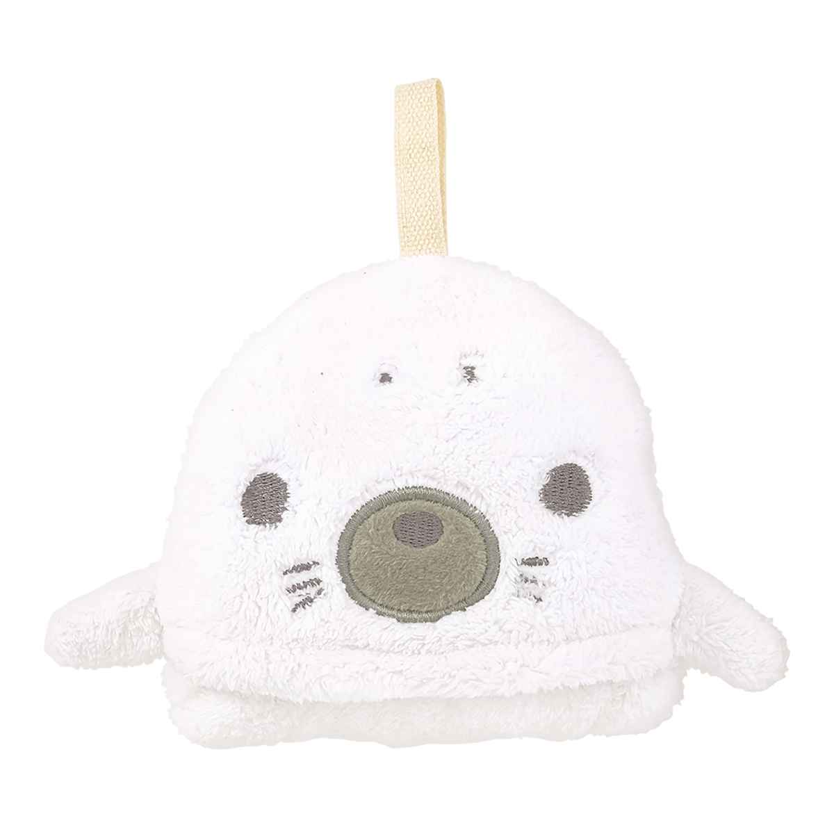 ポケット仕様のタオルです。タオルをアザラシのお顔に向かって丸めるとコンパクトに収納できます。お出掛けの際の持ち運びに便利です。