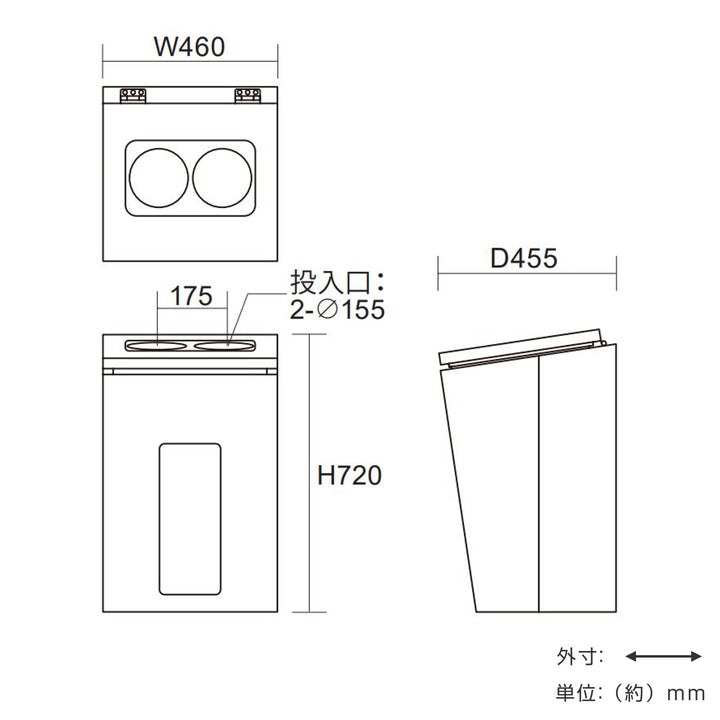 | 材質 | 本体:電気亜鉛メッキ鋼板粉体塗装 投入口・袋抑え:ステンレスヘアライン仕上 窓:再生PET樹脂 |