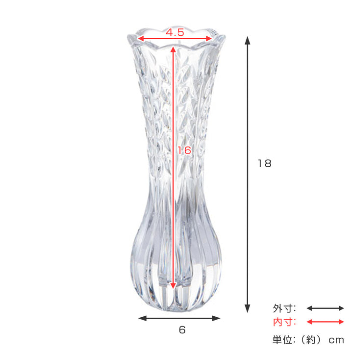 家電製品やカメラなどに使われているプラスチックの一種で、プラスチックの中でも最高の耐衝撃性を持つポリカーボネート製の花瓶です。航空機の窓にも使用されているポリカーボネートはハンマーで叩いても割れません。お子さまやペットのいるご家庭でも安心してお使いいただけます。※傷はつきます。
