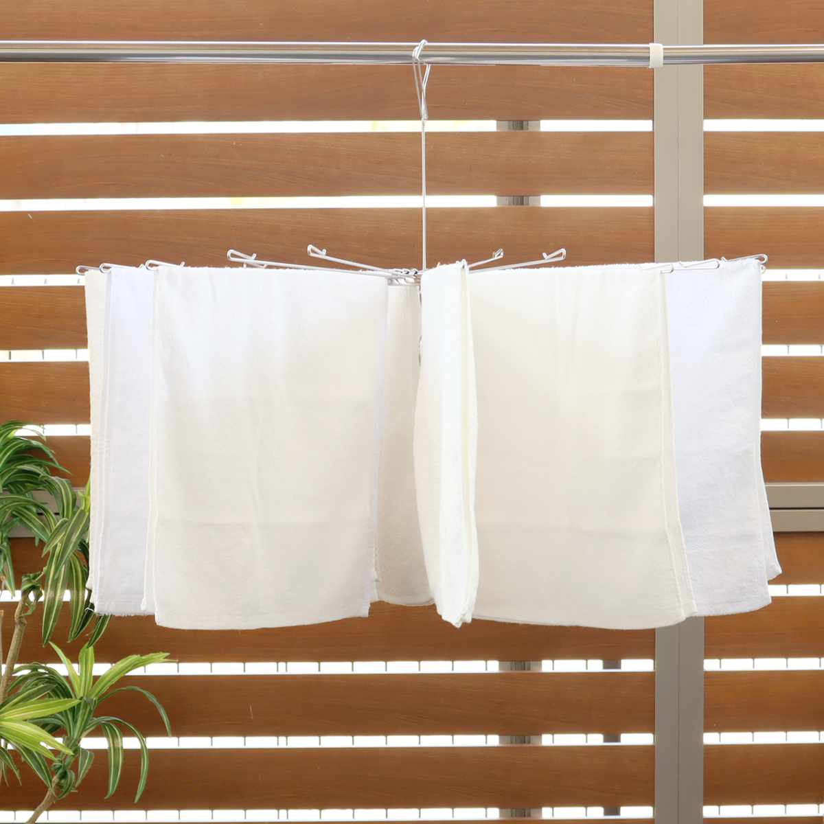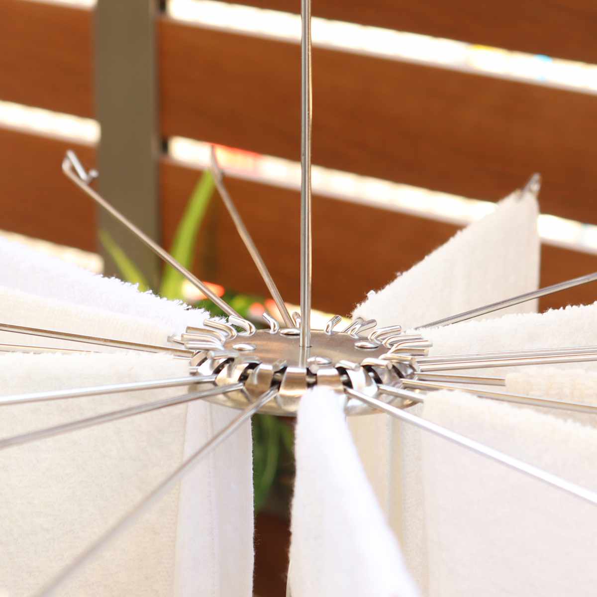 限られたスペースを有効活用して、洗濯物が干せるパラソルハンガーです。洗濯物が一度に20枚干せるので、かさばりやすいタオルや小物類をたくさん干したいときに便利です。風に当たると回転するので乾きが良いです。