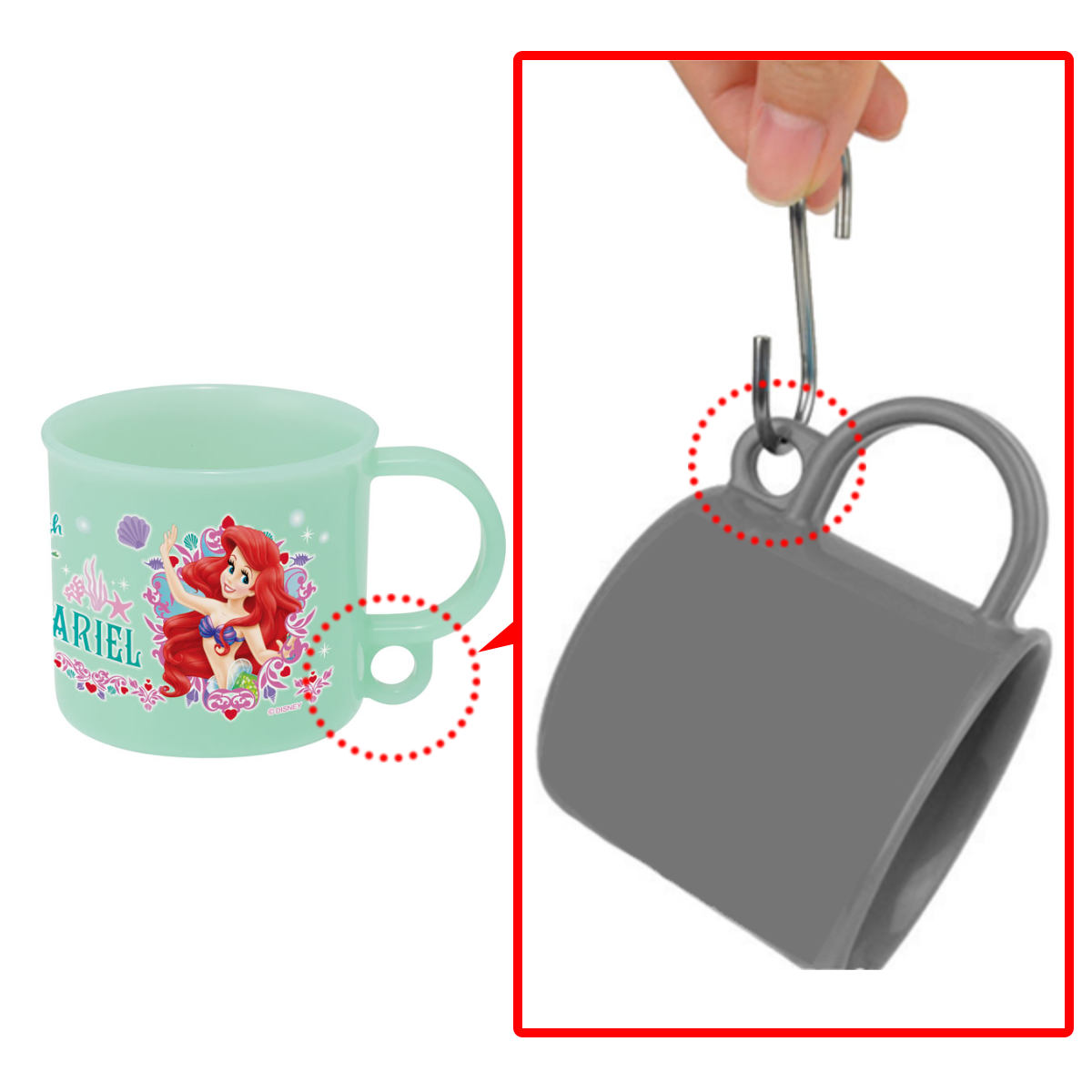 コップの持ち手の下にフックなどに掛けられる部分が付いているので、使用後や洗った後などに逆さにして吊るしておけば、水切れが良くとても衛生的です。