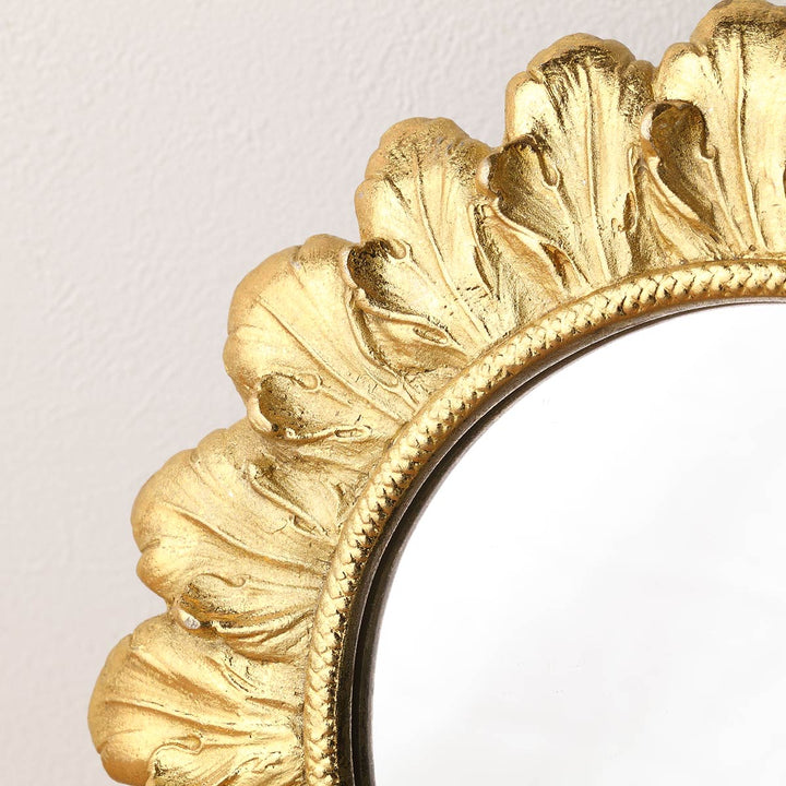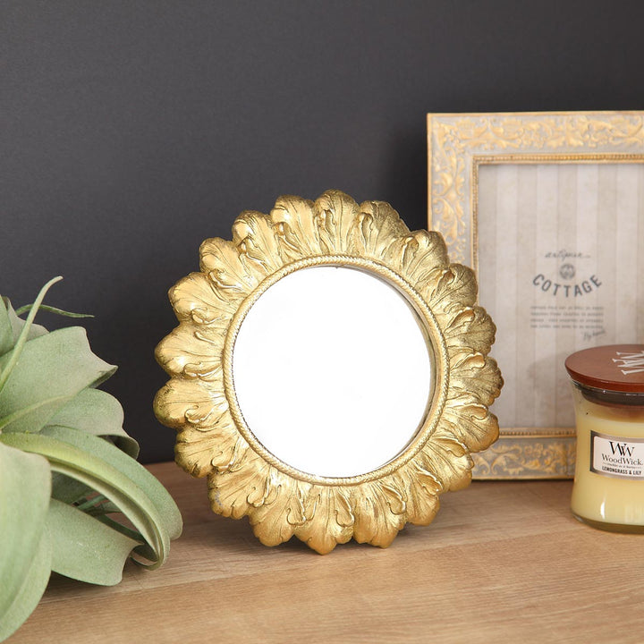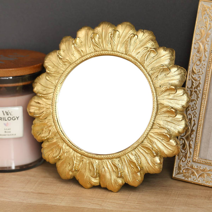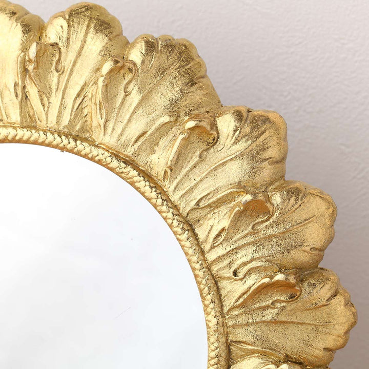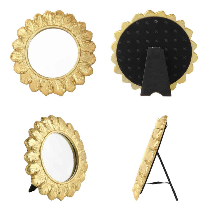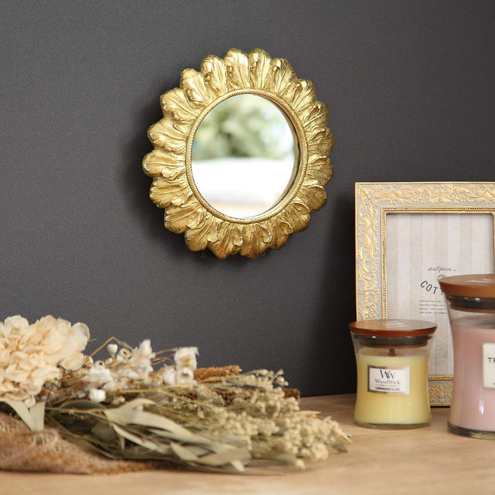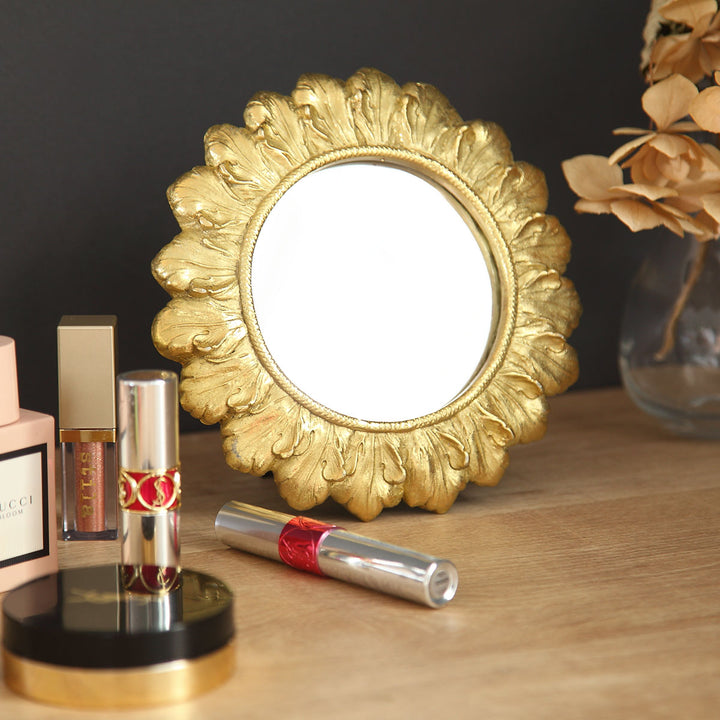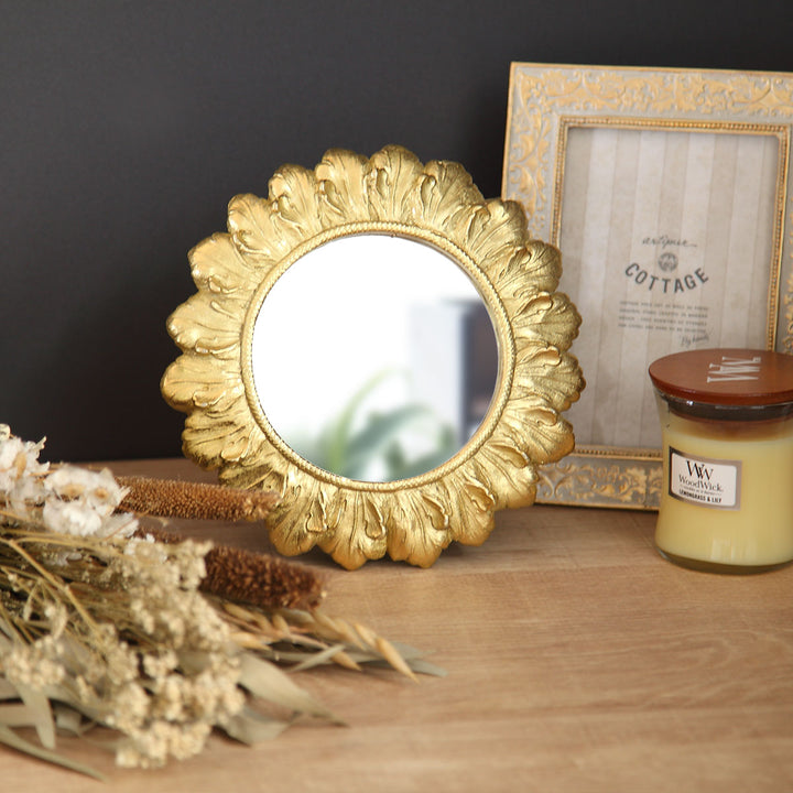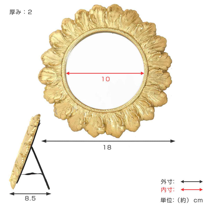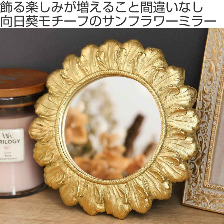 向日葵をモチーフにしたサンフラワーミラーです。壁掛け・スタンドどちらでも使用できるので、お部屋のインテリアに合わせて飾ることができます。華やかで美しいゴールドがお部屋のアクセントになり、飾る楽しみが増えること間違いなしです。