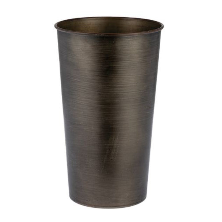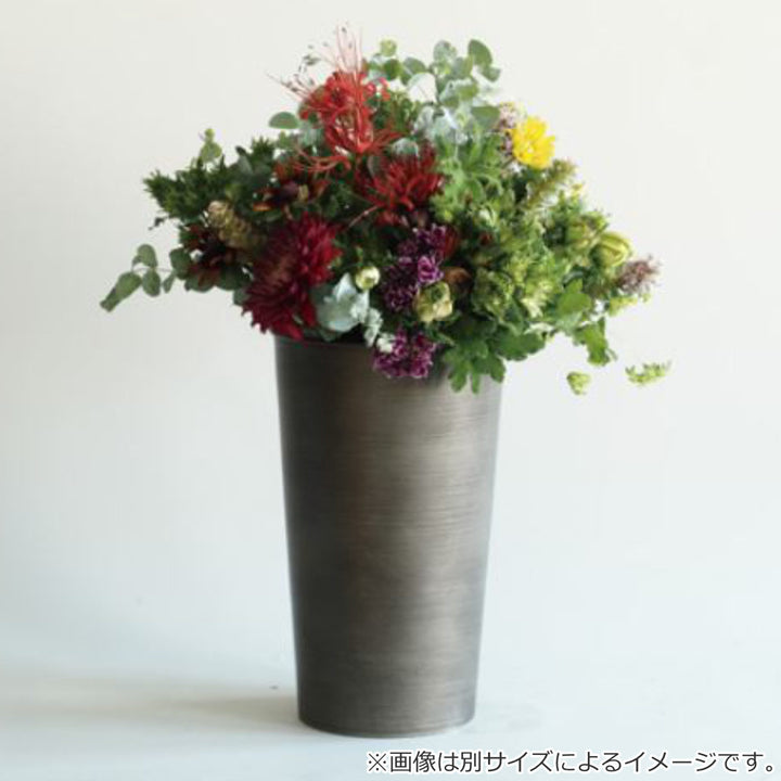 アイアン素材の高さ30cmの円錐型フラワーベースです。ブリキ製品と異なって一枚の板金で作られているので水漏れの心配がなく、錆びにくいラッカー塗装が施されているので、耐久性に優れた花器です。
