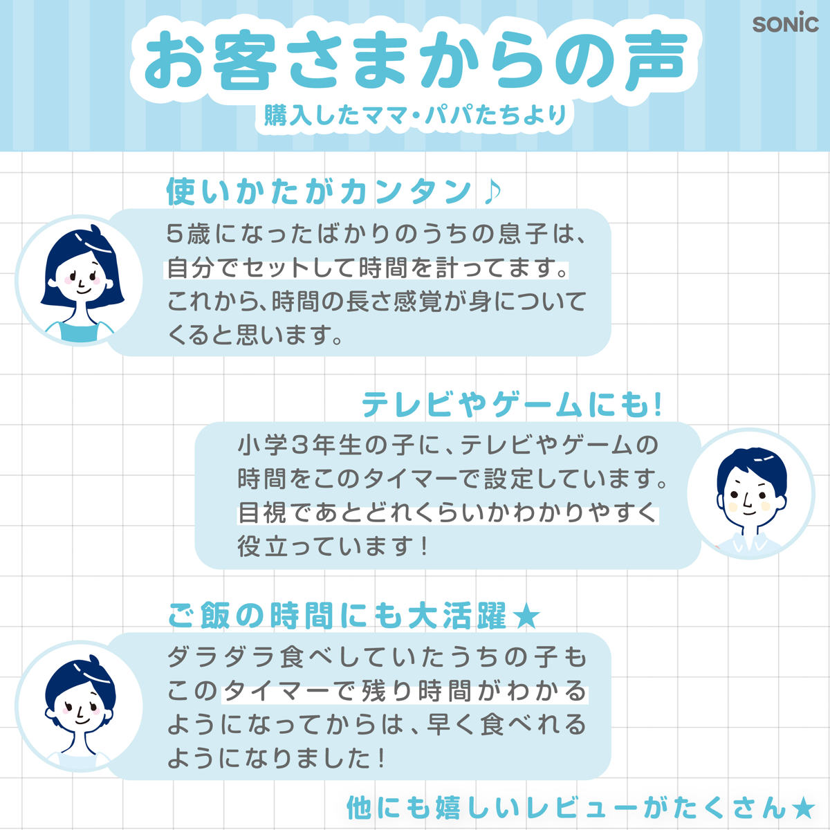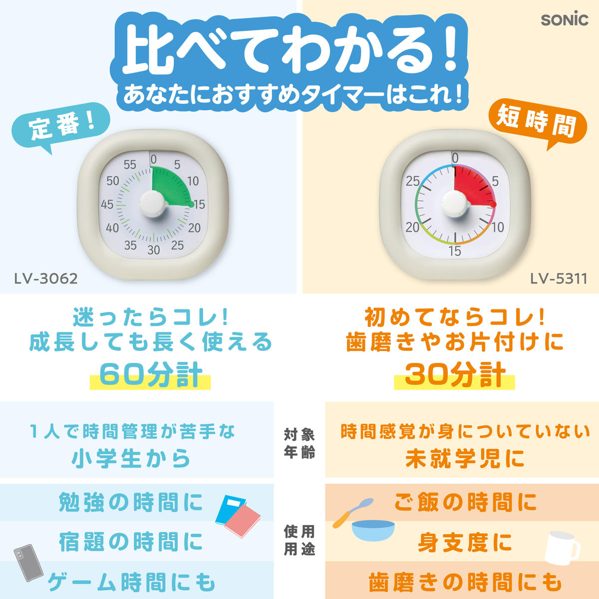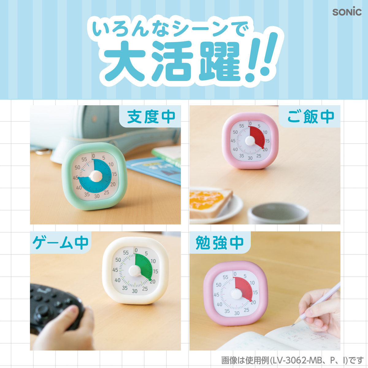学習にはもちろん、ごはんや身支度などの生活シーンでも活躍します。お着替えやごはんに時間がかかる場合もタイマーをセットしてお子様のやる気をサポートします。