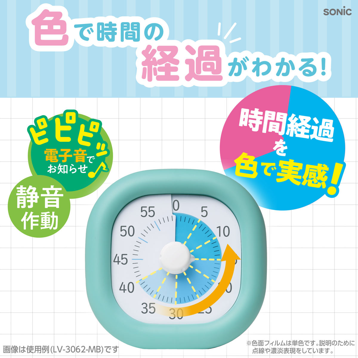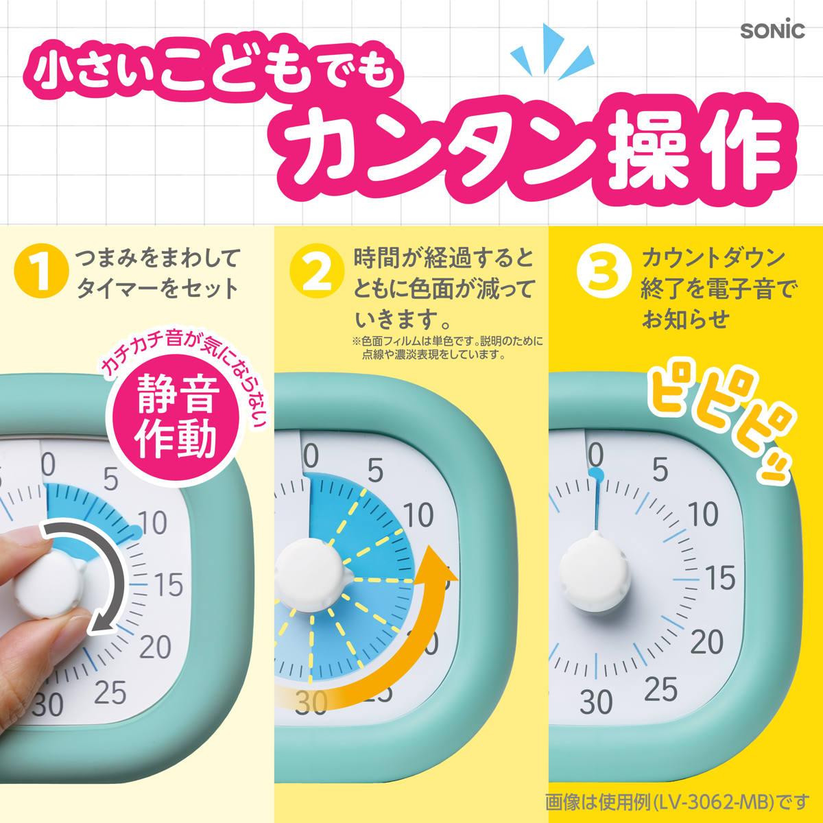時間の経過とともにフィルムが回転、色面が減っていくので、時間の経過を視覚的に実感できます。時計が読めない、時間感覚がまだ身についていないお子様も、目で見てわかります。カウントダウン終了を「ピピピッ」の電子音でお知らせします。タイマーのカチカチ音が気にならない静音作動設計で学習の邪魔になりません。