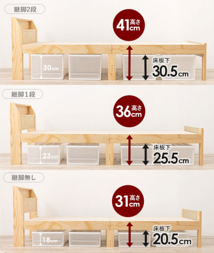 ベッドの高さは3段階で調節することができます。収納する物に合わせて調節したり、お好みの高さに合わせていただけます。