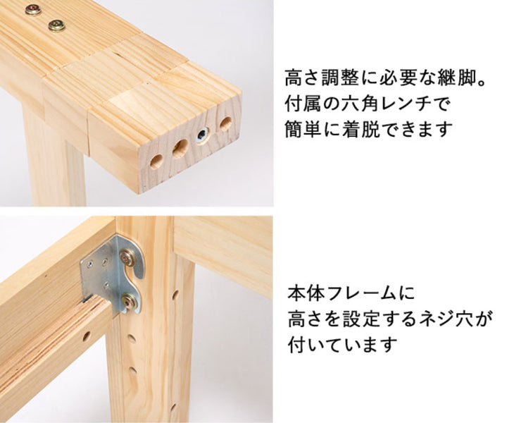 高さは、収納したいものや使用される方の身長に合わせて組立時に調節可能です。高さ調節に必要な継脚は、付属の六角レンチで簡単移着脱できます。また、本体フレームに高さを設定するネジ穴が付いています。