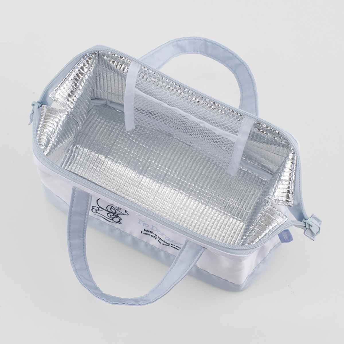 内側はアルミ蒸着素材で保冷バッグとしてお使いいただけます。また、メッシュポケットが内側に付いており、保冷剤入れとしても使えるほか、小物やお菓子などの小さなものを入れておくのに便利です。