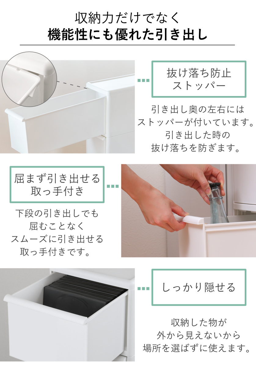 | 材質 | 本体・引出し:ポリプロピレン キャスター:ポリプロピレン、スチール |