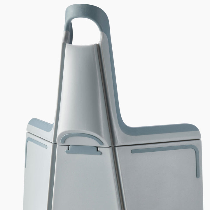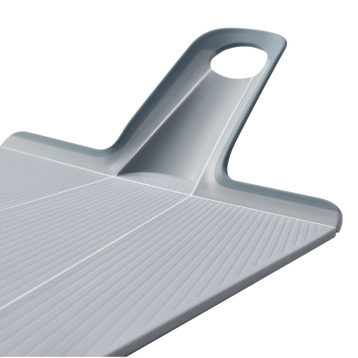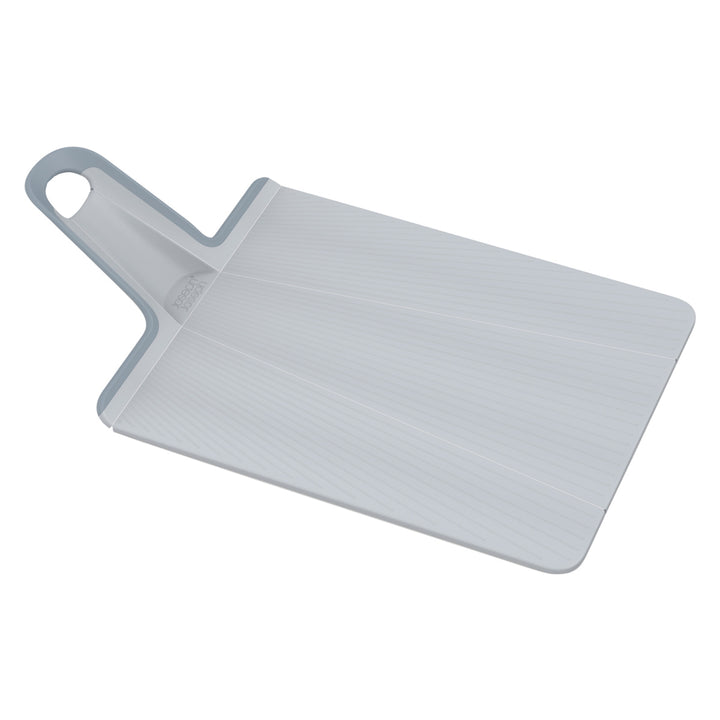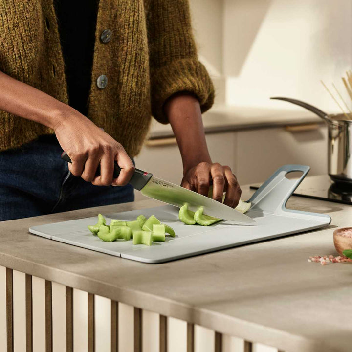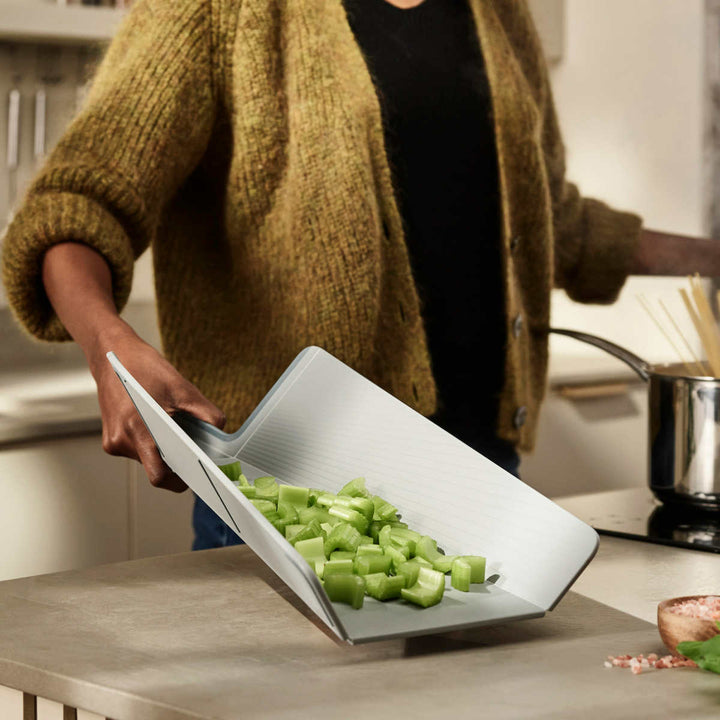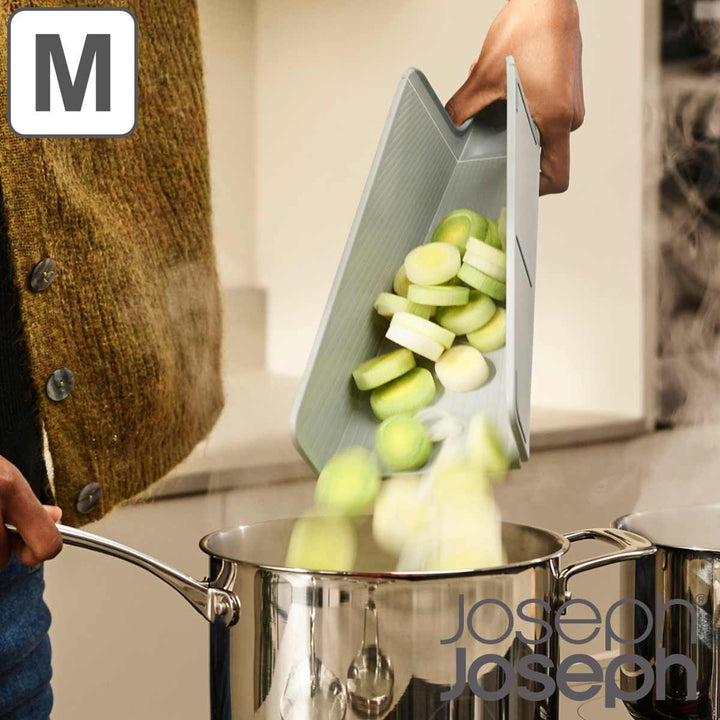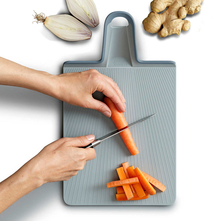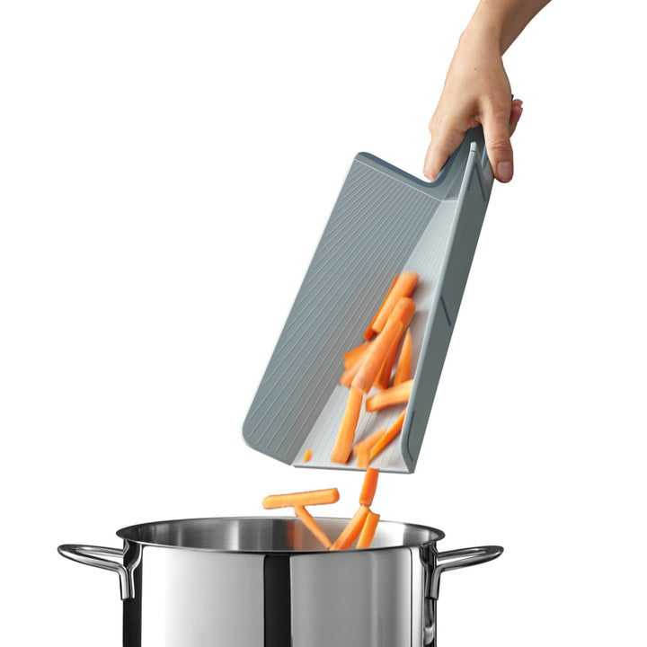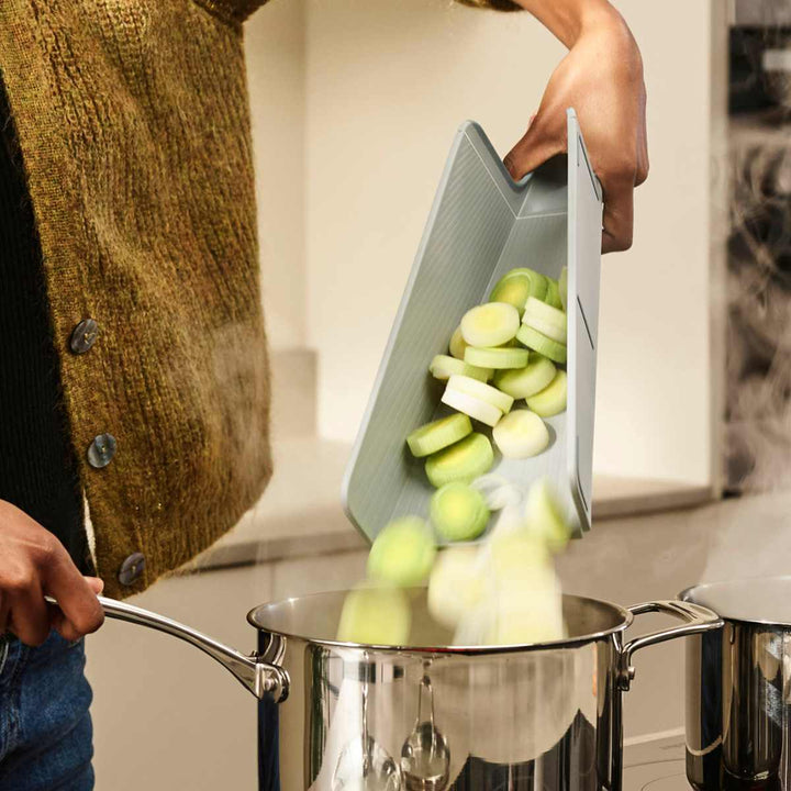 持ち手を掴んで簡単に折りたためる革新的なデザインのまな板です。折りたたんだ部分がガイドとなって、切った食材をスムーズにフライパンやお鍋に移すことができます。片手で使えるので他の作業も同時に行えます。