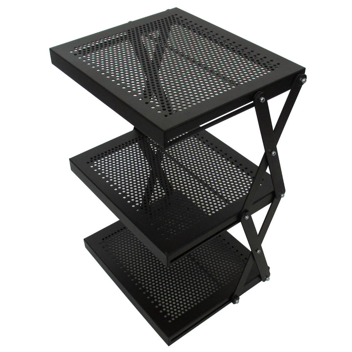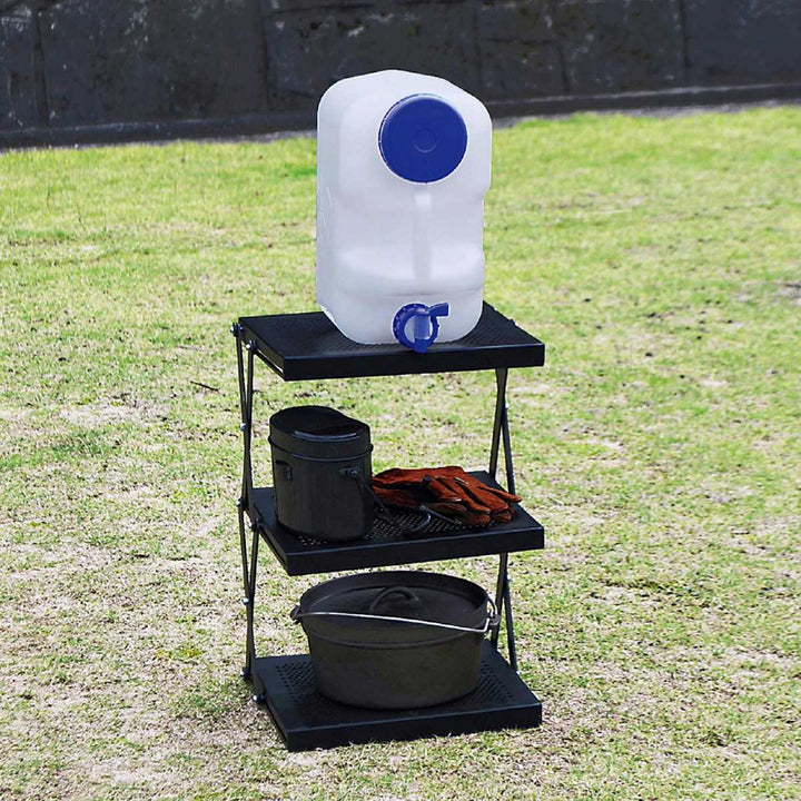 ●アウトドア用品をすっきり整頓出来る、折り畳み式の3段のフォールディングラックです。